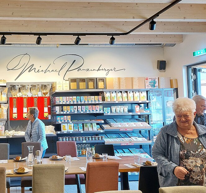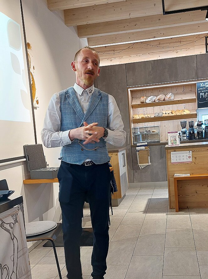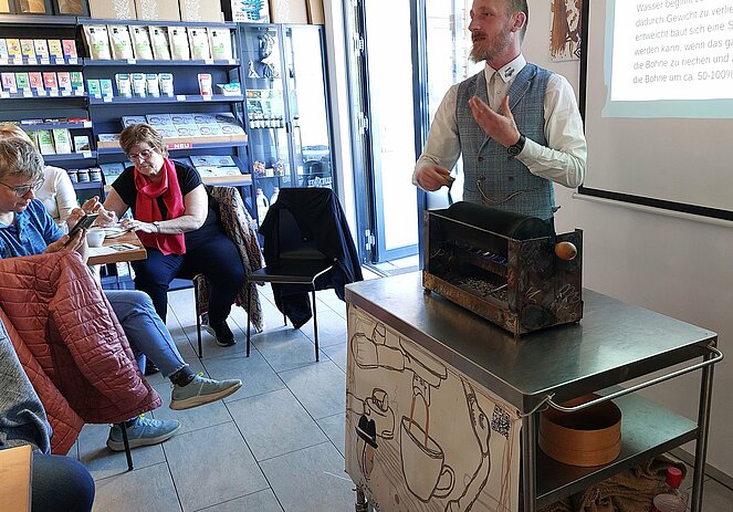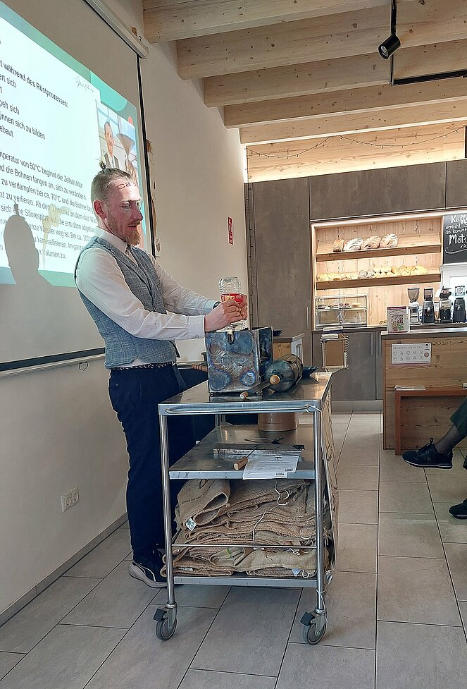 Seinen interessanten Lebenslauf schilderte uns Michael Pauzenberger, der Besitzer der Schaurösterei. Den ersten Kaffeeröster hat er sich selbst geschweißt, unterstützt von seinem Großvater. Mit diesem Röster hat er bisher 1,3 Tonnen Kaffee selbst händisch geröstet. Und besucht hat er alle entsprechenden Kurse zum Thema Kaffee von Hamburg bis Triest. 2017 hat er ein Kaffeefachbuch veröffentlicht, er schreibt Kinderbücher und 2019 wurde das Geschäft neu gebaut. Eine Kaffeepflanze schmückt seinen Laden, ca. 20 cm groß. Dabei sollte diese Pflanze in optimaler Lage 3 m hoch sein. Unser Klima ist wirklich total ungeeignet zum Anbau von Kaffeepflanzen.