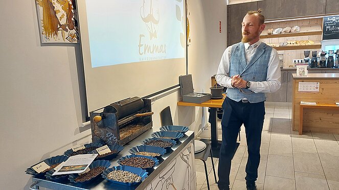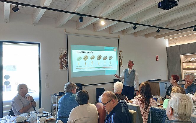 22 Mitglieder trafen sich bei der Kaffeerösterei Emmas in Kallham zur Kaffeeverkostung. Und damit starteten wir auch gleich: Robusta und Arabica-Kaffee – in dieser verkosteten Form aber gar nicht zu erwerben.