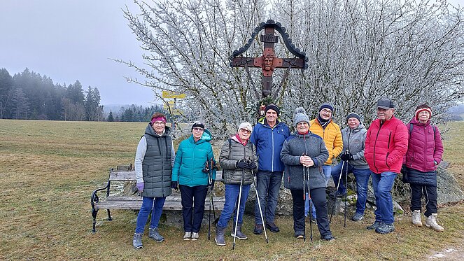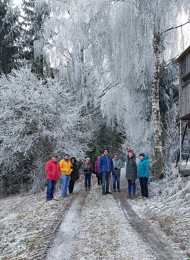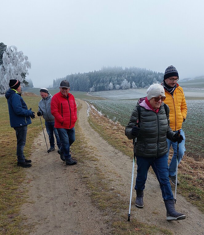 Langsam zieht die Kälte ein, Weihnachten und das Jahresende stehen vor der Tür. Doch das hielt uns nicht davon ab: Zehn Wanderbegeisterte trafen sich in Schenkenfelden um gemeinsam die letzte Tour des Jahres 2025 zu unternehmen. Renate hat eine wunderschöne Route ausgewählt, die im Ort Schenkenfelden startete und uns anschließend auf Wiesen-, Feld- und Waldwegen die winterliche Landschaft erleben ließ. Auf den Anhöhen wehte ein frischer Wind, die Natur präsentierte sich in ihrem ruhigen, winterlichen Kleid.