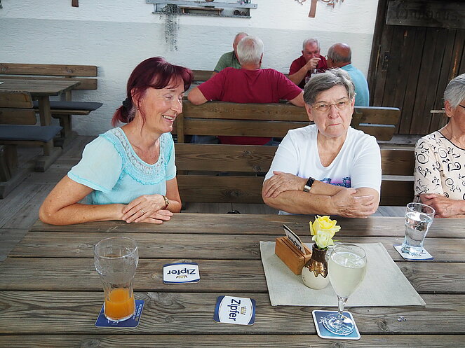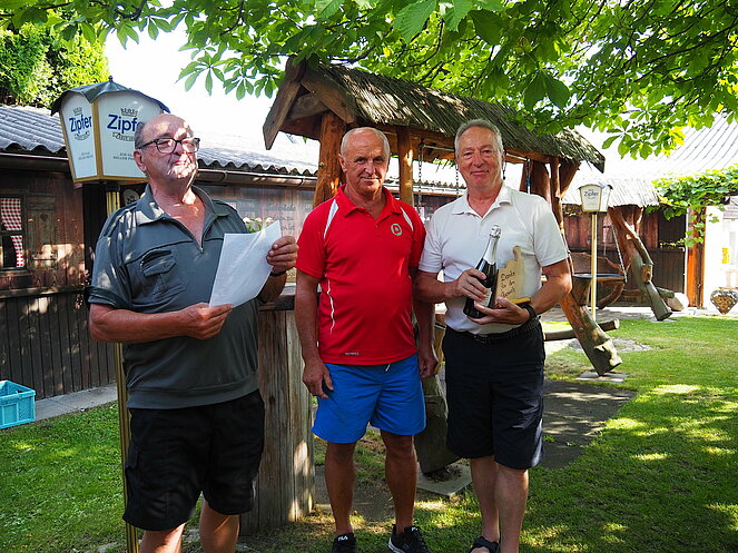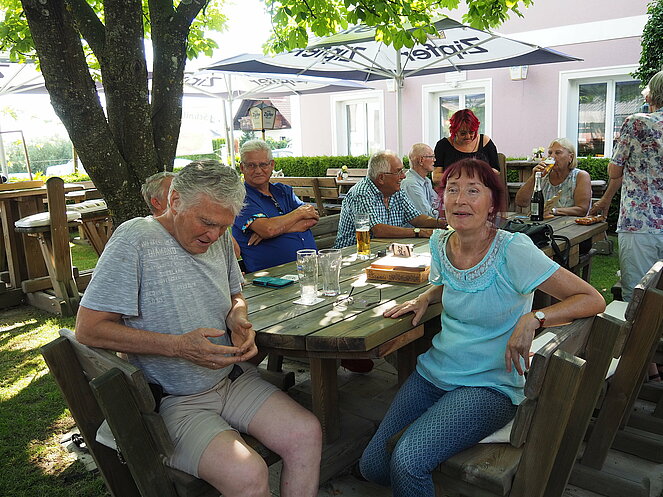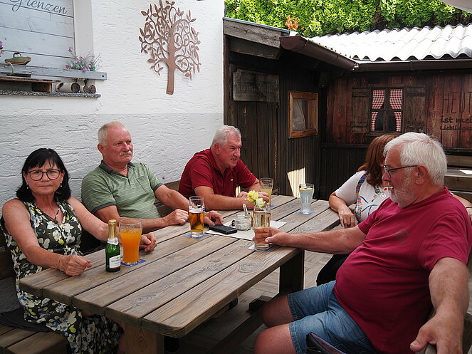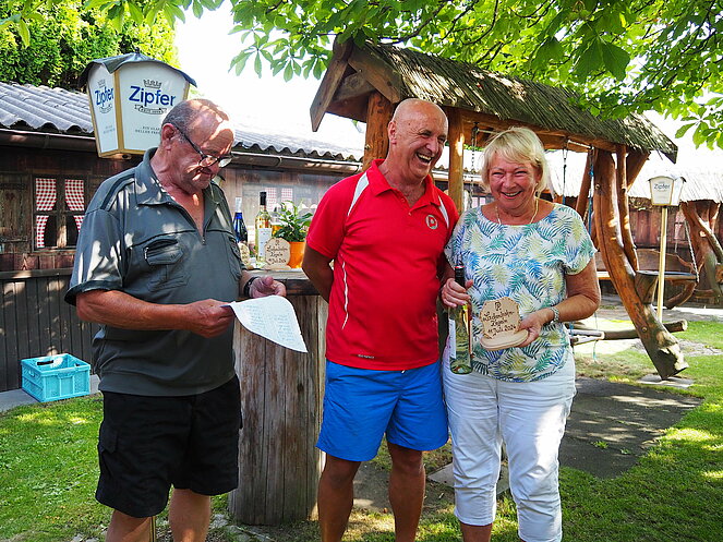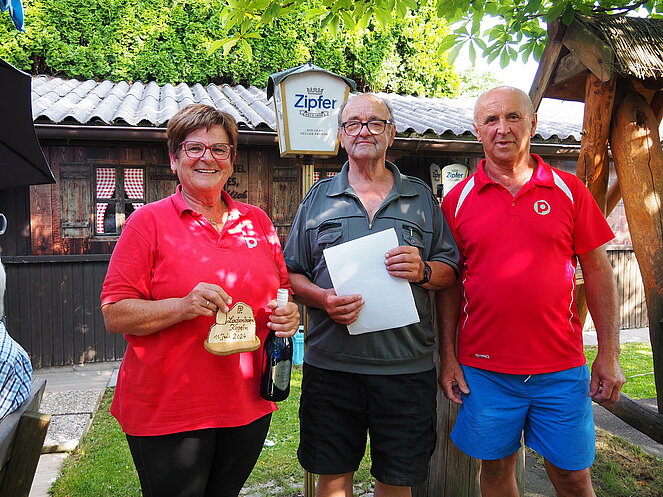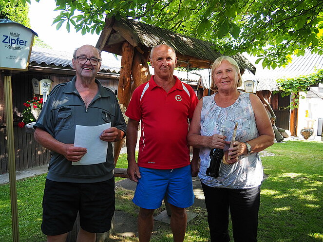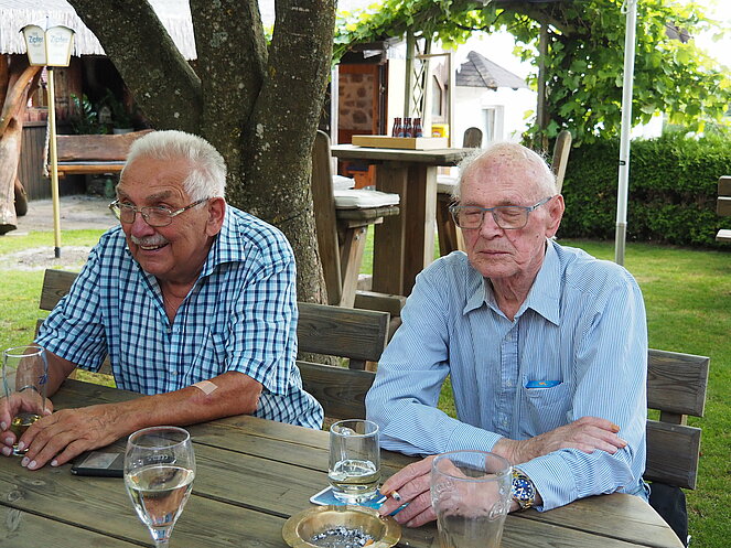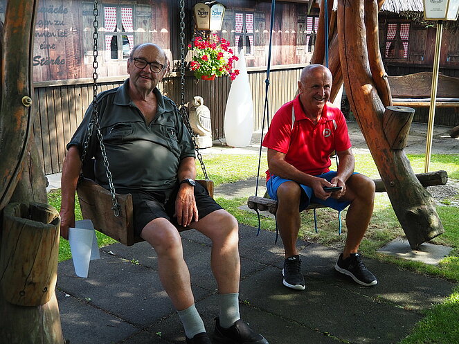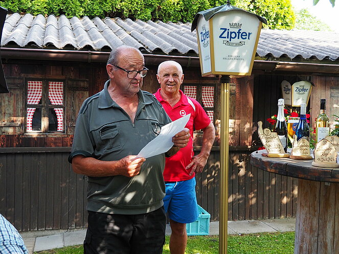 Otto Purner und Franz Vogl nahmen auch gleich das Ruder in die Hand. Fleißig wurde auf der Ladenbahn gekegelt, während im Gastgarten munter getrascht wurde und die Leckermäuler unter uns kühlten sich mit „Heißer Liebe“ ab.