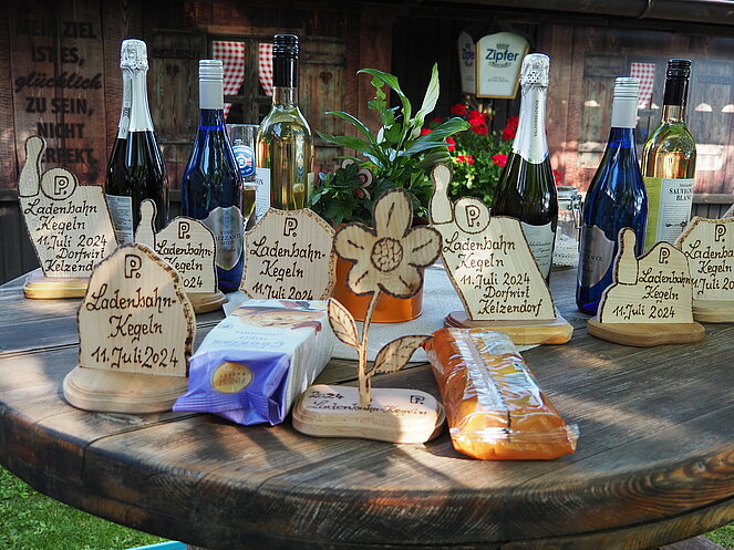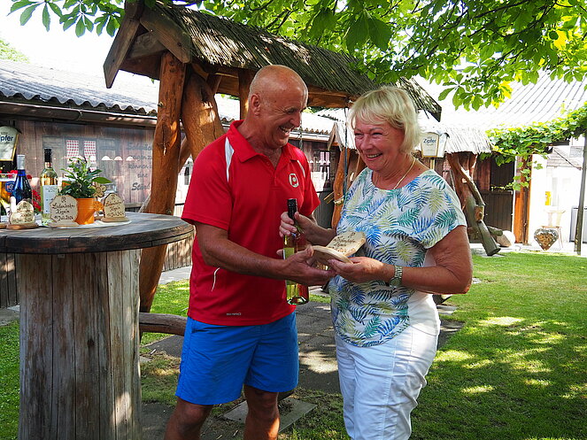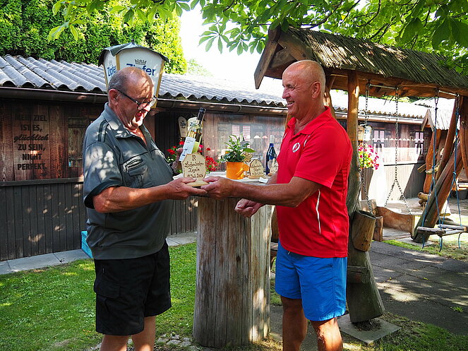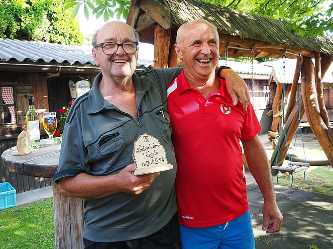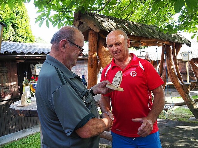 Natürlich gab es auch einen Trostpreis für die letzten des Wettbewerbes. Auch der Wirt Andreas erhielt von Otto Purner eine Auszeichnung in Form einer geschnitzten Blume als Dankeschön-Geschenk für die Benutzung der Ladenbahn, aber auch für die sehr gute Bewirtung und die köstliche Jause im Gastgarten. Gemütlich war es wieder und wir kommen im nächsten Jahr gerne wieder.