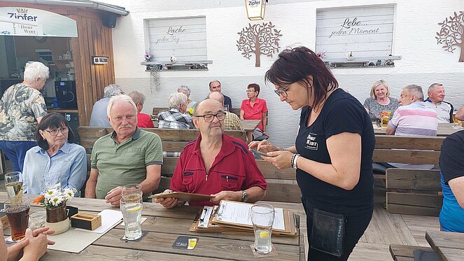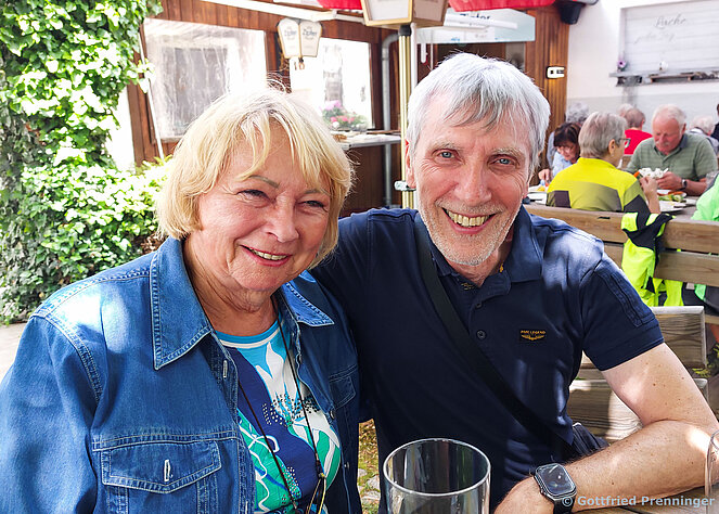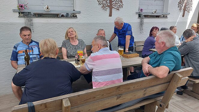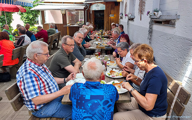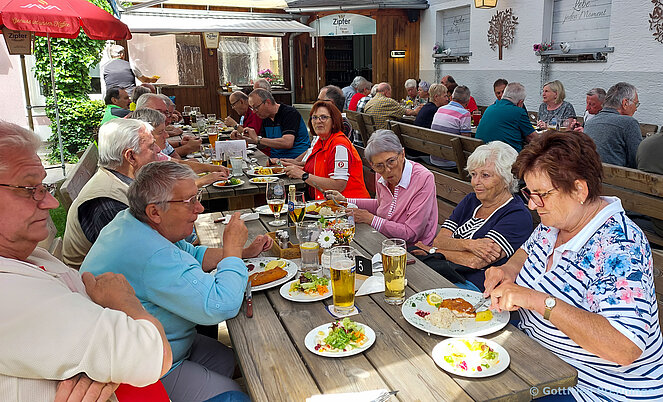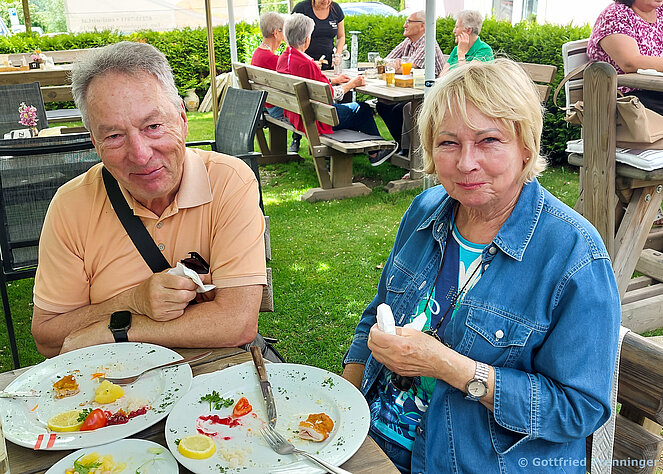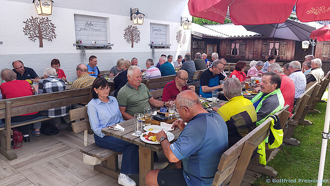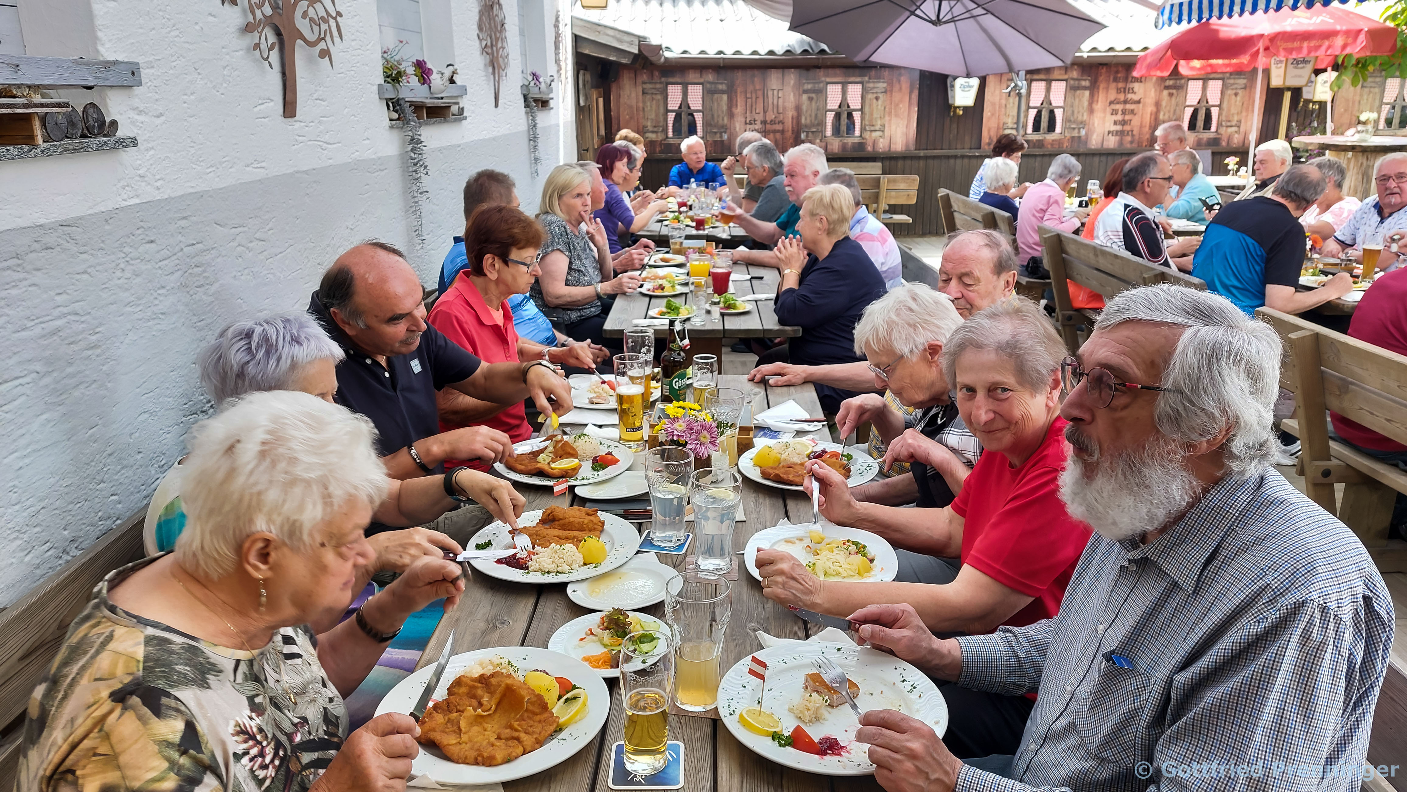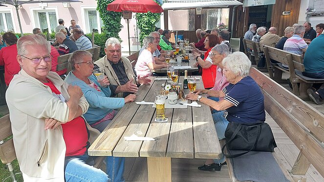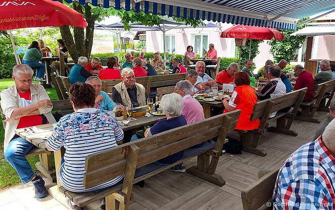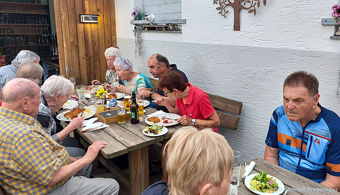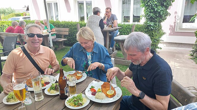 Warmes schönes Sommerwetter ermöglichte es uns im Gastgarten vom Dorfwirt Platz zu nehmen. „Schnitzerl“ als klassisches Wiener Schnitzel vom Schwein oder von der Pute, als Cordon Bleu oder als Surschnitzel, dazu entweder Kartoffel, Reis oder Pommes, natürlich auch Preiselbeermarmelade und gemischten Salat – und das zu einem erstaunlichen Preis. Selbstverständlich standen auch noch Vor- und Nachspeise auf der Karte. Und der Wirt Andi hat wieder alles sehr schmackhaft zubereitet - großes Lob. Danke aber auch an die Wirtin Manuela für ihre Flexibilität. Denn anstatt der reservierten 30 Personen waren wir 42 – aber alles hat perfekt geklappt.