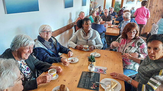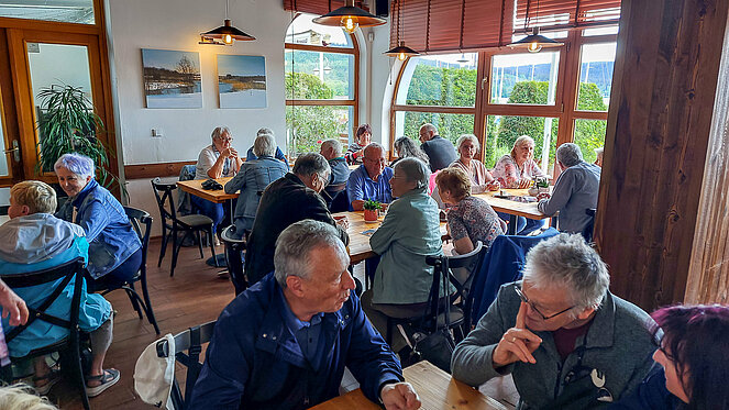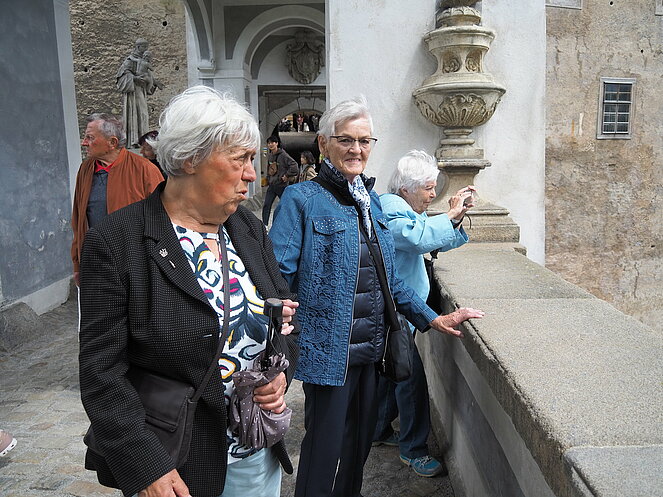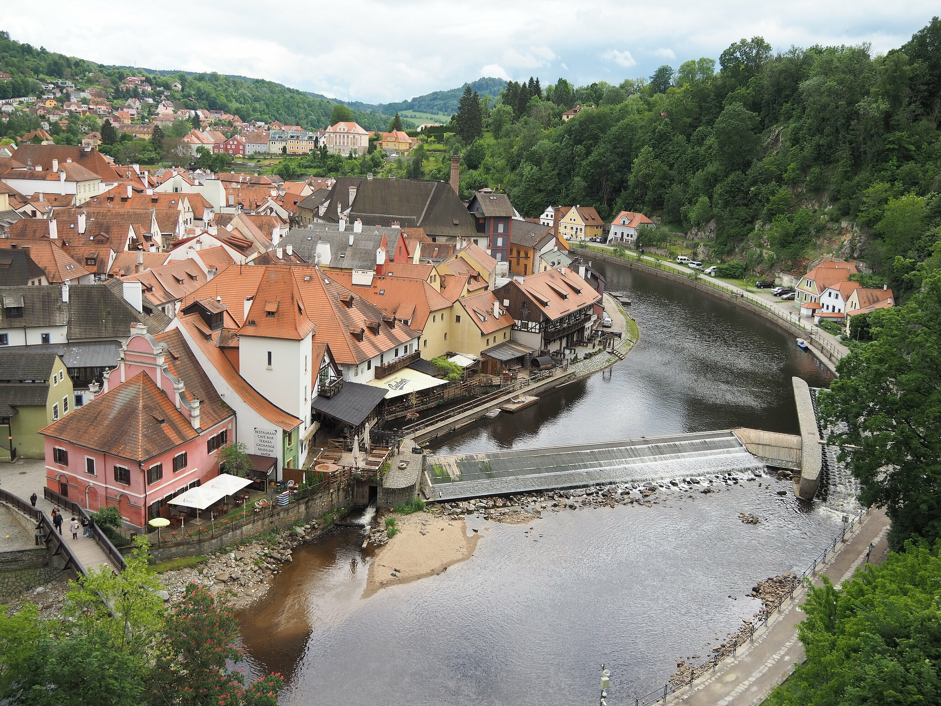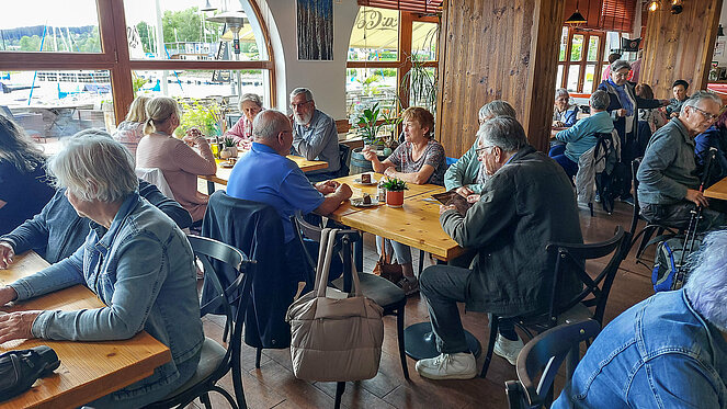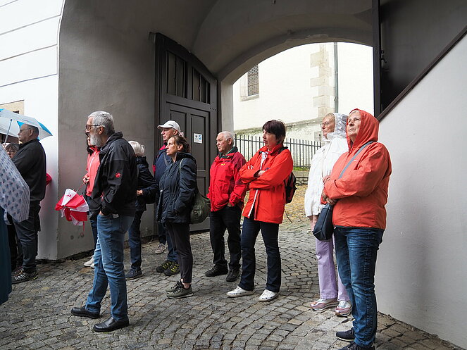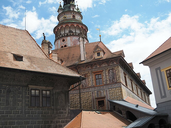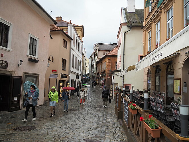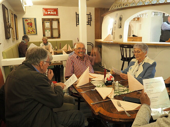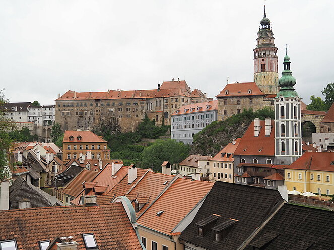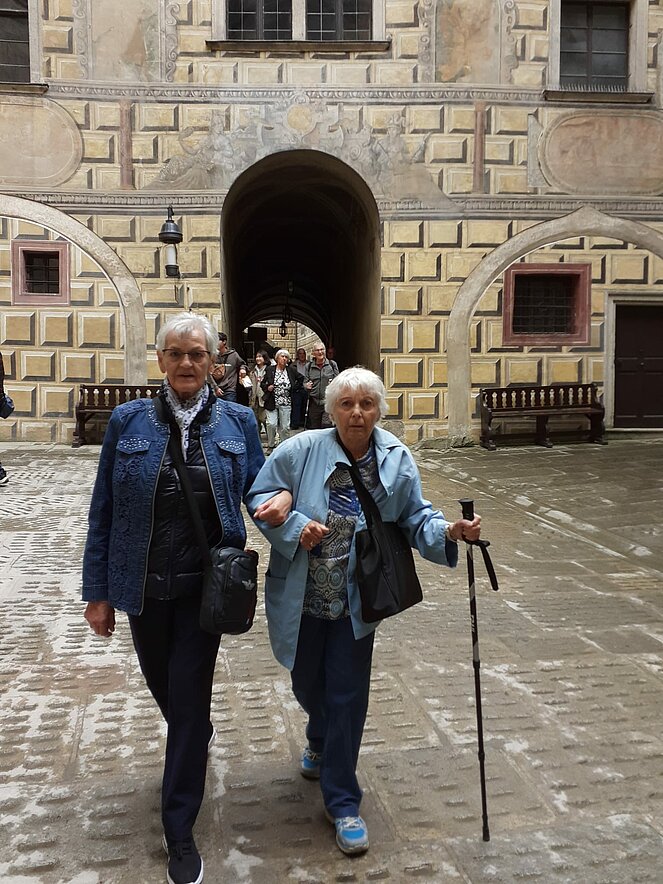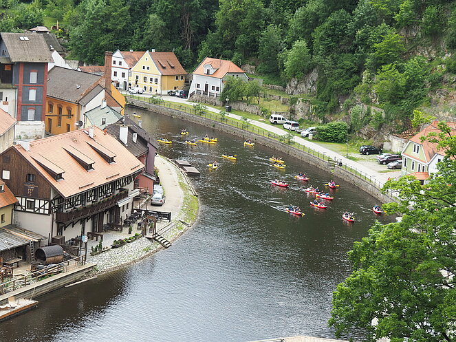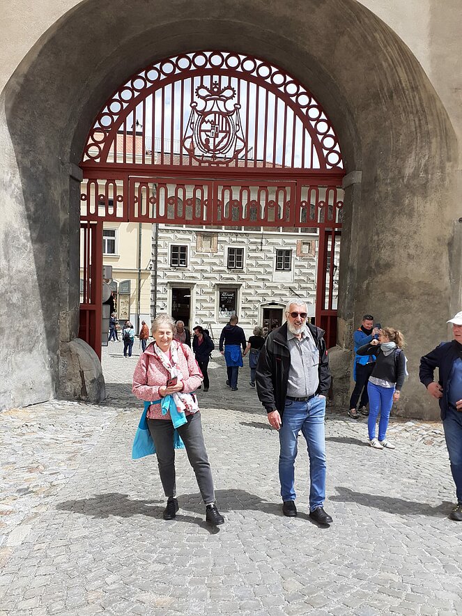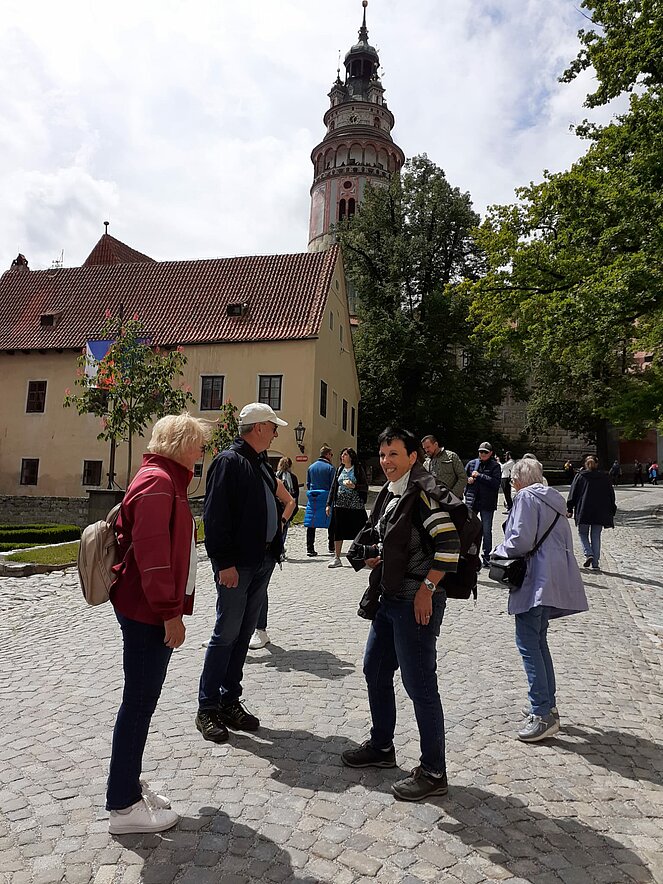 In Krumau angekommen erwartet uns unserer Guide Stanislav. Von ihm erhalten wir eine Stadtführung der besonderen Art, humorvoll und die eine und andere Horrorgeschichte zu Krumau fehlte auch nicht. Krumau ist eine Stadt mit 12.000 Einwohnern, die 2019 2 Millionen Touristen zu bewältigen hatte. Neben Freistadt ist Krumau eine der wenigen noch bestens erhaltenen mittelalterlichen Städte Europas, die ein ganz besonderes Flair ausstrahlen. Zum Mittagessen kehrten wir im Restaurant Don Julius ein. Ein Spaziergang durch die Stadt, entlang der vielen Geschäfte führte uns dann zur Burg hinauf. Die Burganlage ist eine der bedeutendsten in Mitteleuropa. Einen herrlichen Ausblick auf die Stadt und auf die Moldau, auf der bereits viele Kanu- und Schlauchbootfahrer unterwegs sind, kann man von dort oben genießen. Unser Rundgang durch die Schlosshöfe endete dann bei unserem Busparkplatz. Die Weiterfahrt nach Lipno ging entlang des Moldau-Stausees. Nach einer Einkehr auf Kaffee, Kuchen oder Eisbecher traten wir unsere Heimreise an. Ein schöner gelungener Ausflug, bei dem es zwar am Vormittag immer wieder leicht regnete, aber am Nachmittag durften wir uns an warmen Sonnenstrahlen erfreuen.