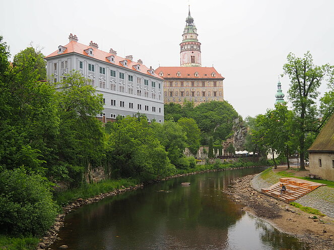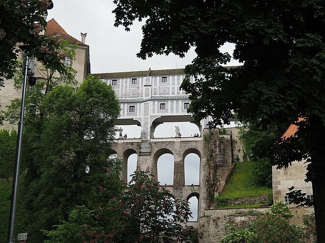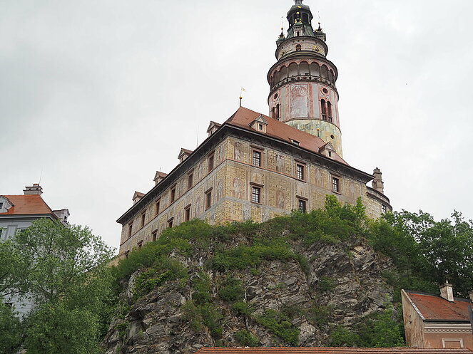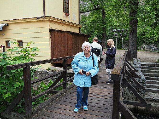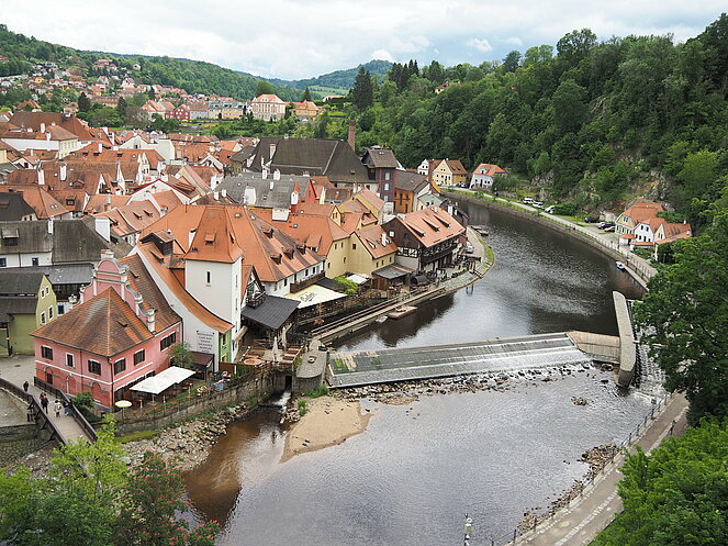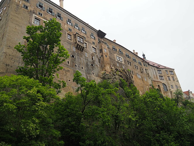 Unser Tagesausflug am 22. Mai führte uns ins Nachbarland Tschechien, nach Krumau und Lipno. Die Hinfahrt machten wir entlang der Moldau über Rosenberg. Die für einen Bus schmale Straße schlängelt sich entlang der Moldau durch alte Baumalleen, entlang steiler felsiger Hänge, die aber mit Stahlnetzen gut befestigt sind, durch eine beeindruckende unberührte Natur.