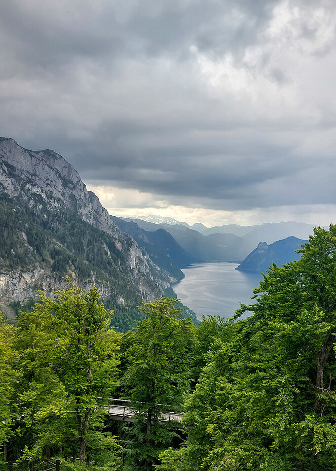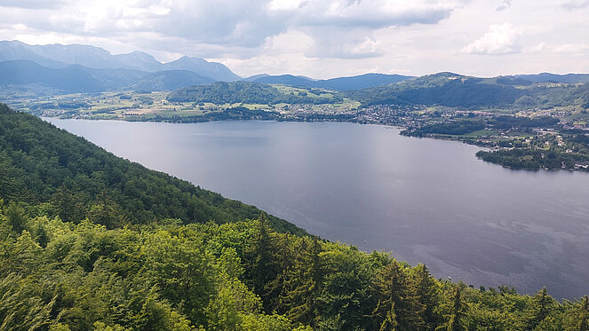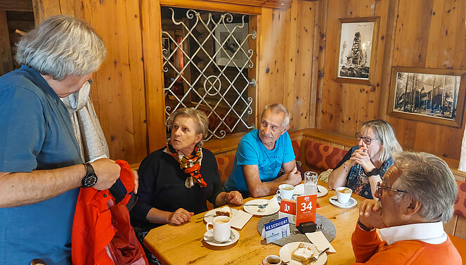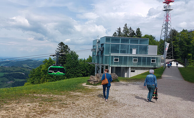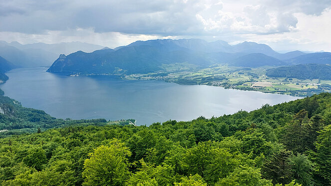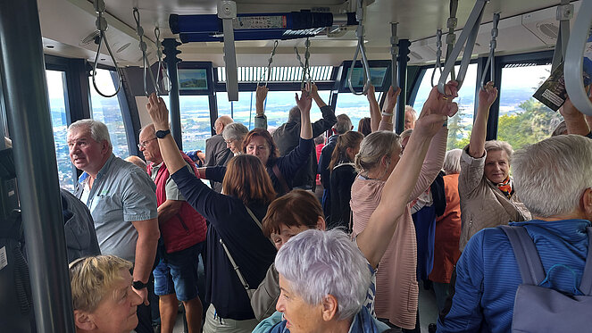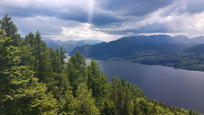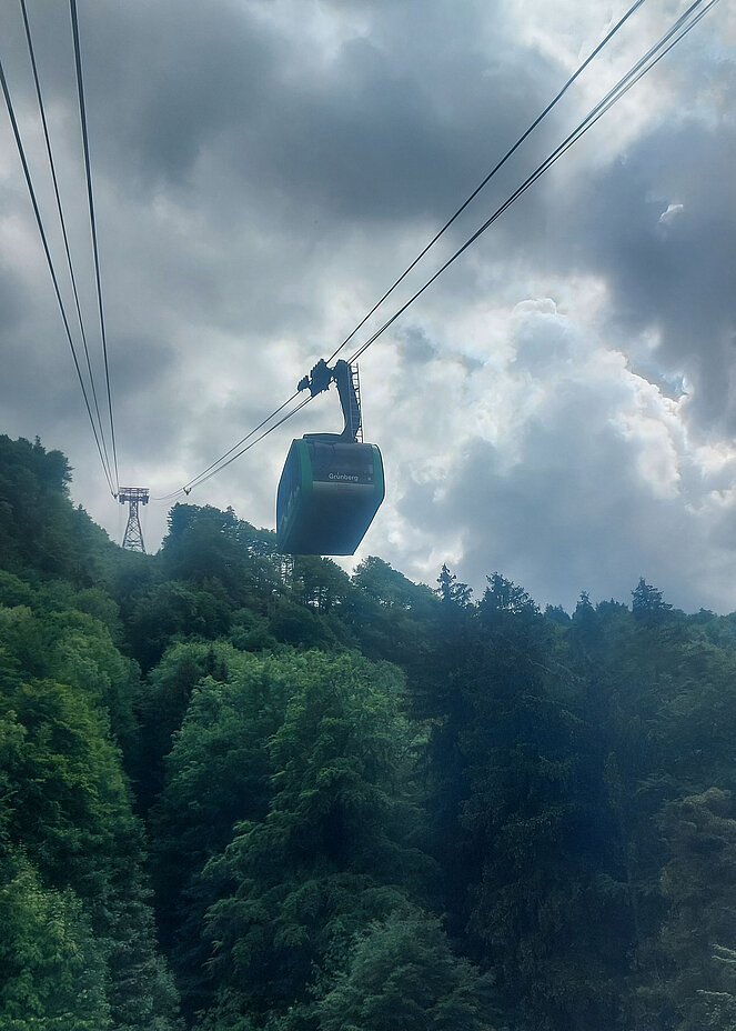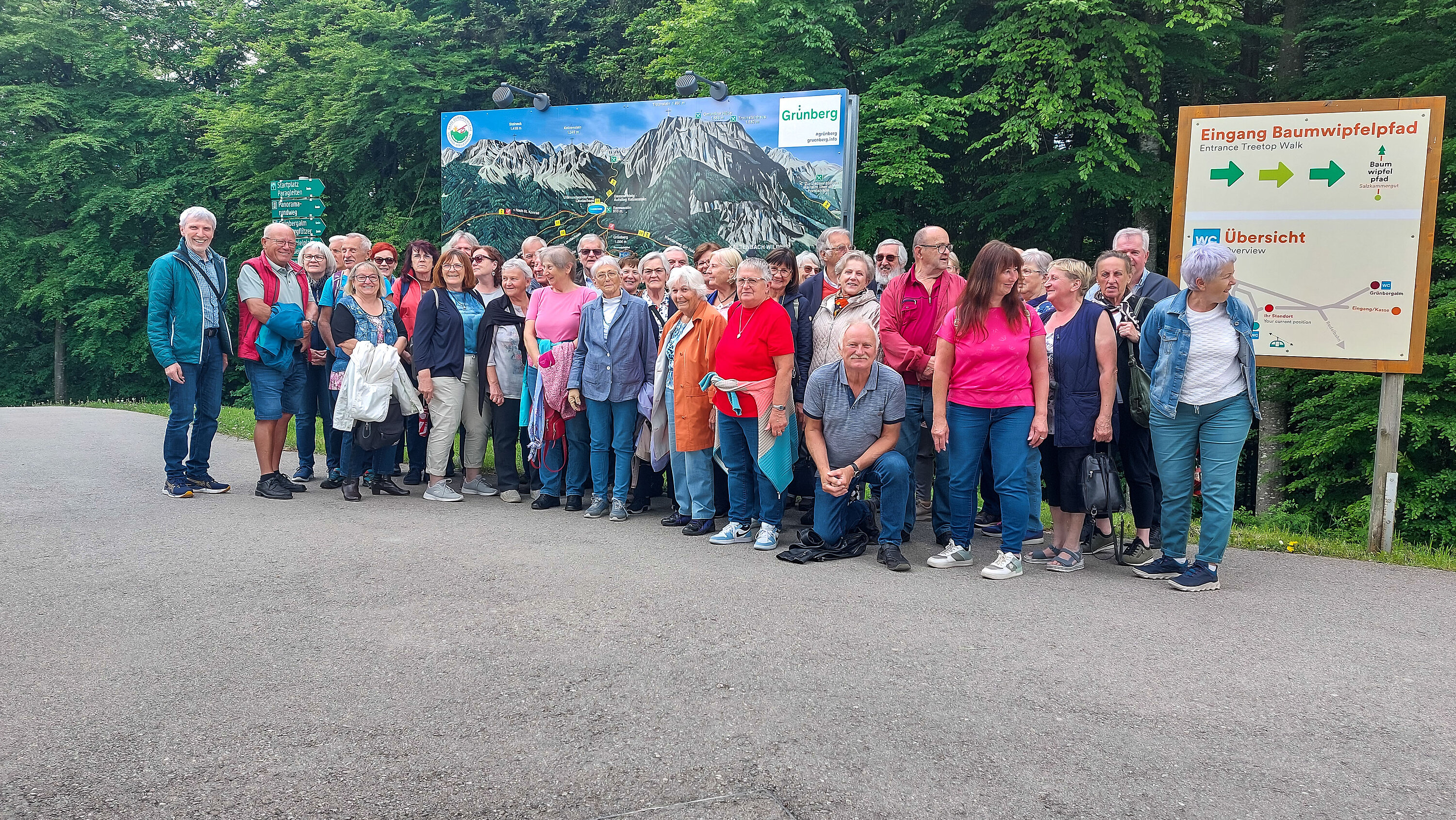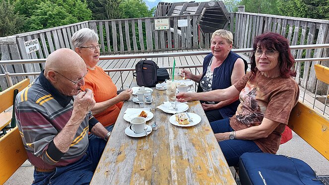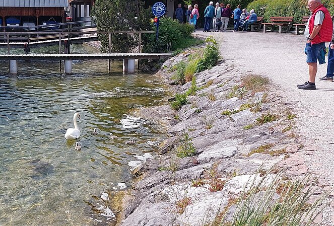 Den Nachmittag verbrachten wir dann auf dem Grünberg, den wir mit einer Seilbahnfahrt erreichten. Einige entschieden sich den Baumwipfelpfad mit Aussichtsturm zu erkunden, andere wiederum kehrten im Gastgarten der Grünbergalm ein und genossen ihr Eis oder Kaffee mit sehr guten Topfenstrudel. Leider konnten wir den schönen Almgastgarten nicht allzulange genießen, einige Tropfen vertrieben uns ins Innere der Hütte, wo dann aber ausgiebigst getratscht wurde. Erwähnen möchten wir schon auch, dass die Preise auf der Grünbergalm noch sehr human sind und das Personal ausgesprochen freundlich war. Um 16.15 h ging es wieder mit der Seilbahn hinunter nach Gmunden, wo uns der Traunsee erwartete. Schön waren im See die „Schwaneltern“ mit ihren Jungen zu beobachten.