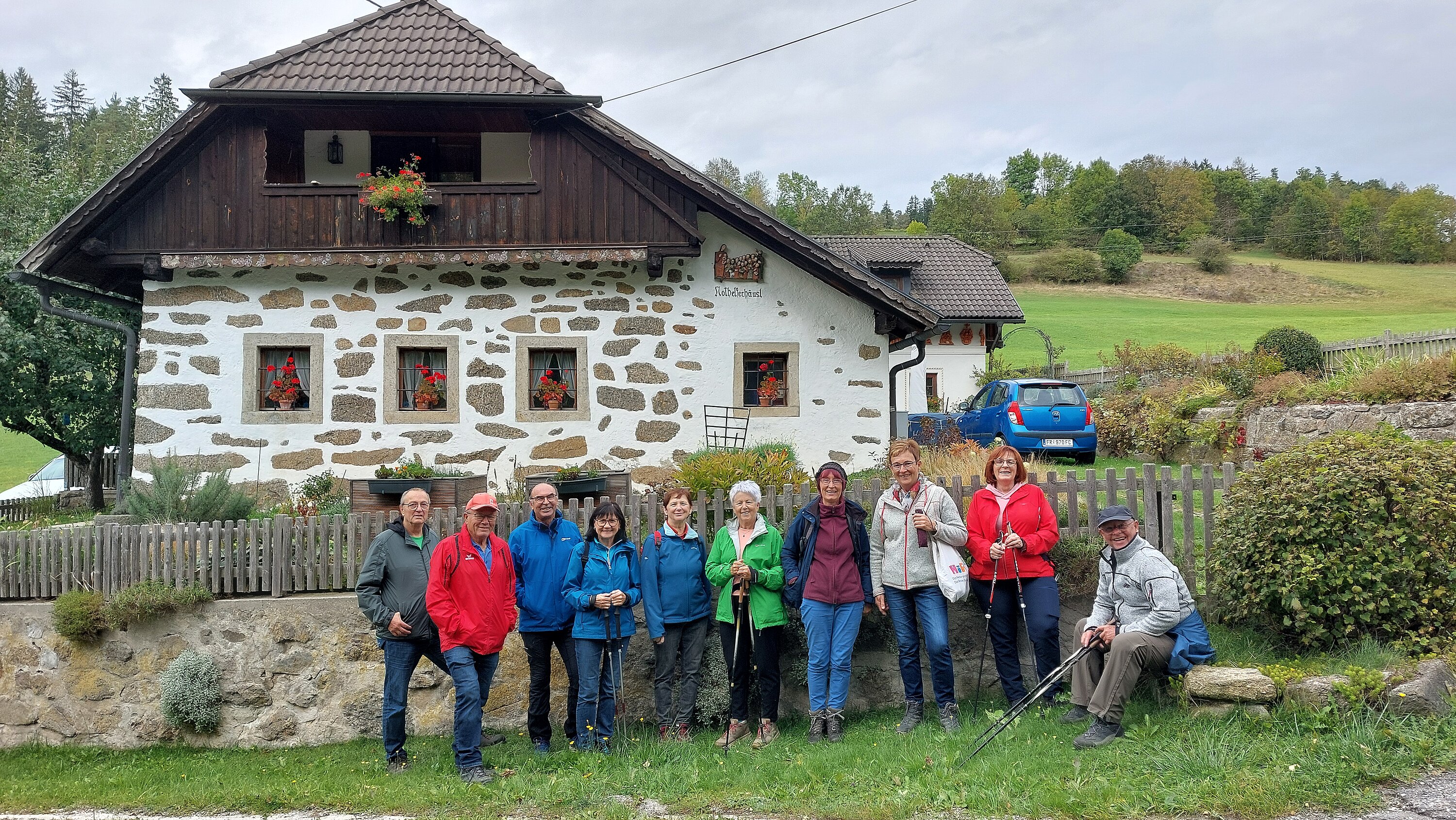 Unsere Wanderung starteten 11 Wanderfreunde in Hirschbach. Obwohl es ab Hirschbach den Anschein hat, dass es überall nur steil bergauf geht, fand unsere Wanderguide Sepp eine 8 km lange Strecke, die nur ca. 200 hm aufwies und großteils auf sanften Wiesen- und Feldwegen verlief. Und diese Wanderung war auch für Pilzsucher und -liebhaber eine erfolgreiche Wanderroute und für den einen und anderen war damit auch das Mittagessen für den nächsten Tag gesichert – selbst gepflückt in der freien Natur. Einen kleinen Zwischenstopp gab es auch noch beim Bauernhof von Familie Ecker, und so wurde auch noch Topfen eingekauft und einige stillten sich den Durst mit einem sehr köstlichen kühlen Jo-Drink.