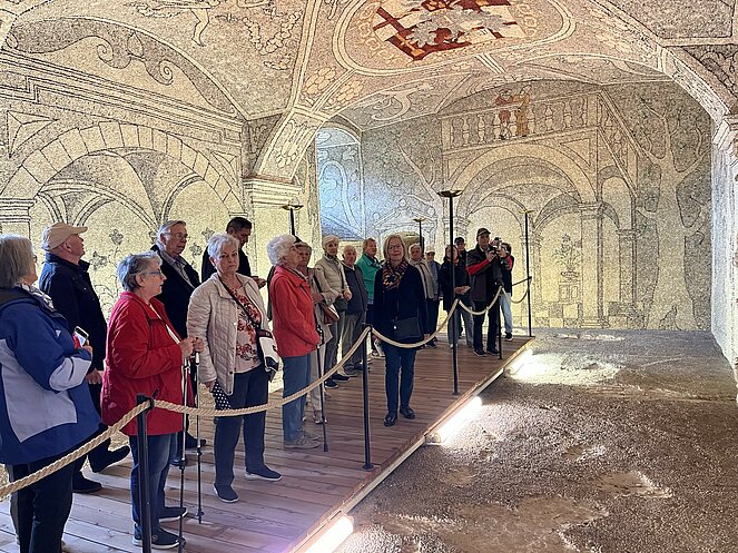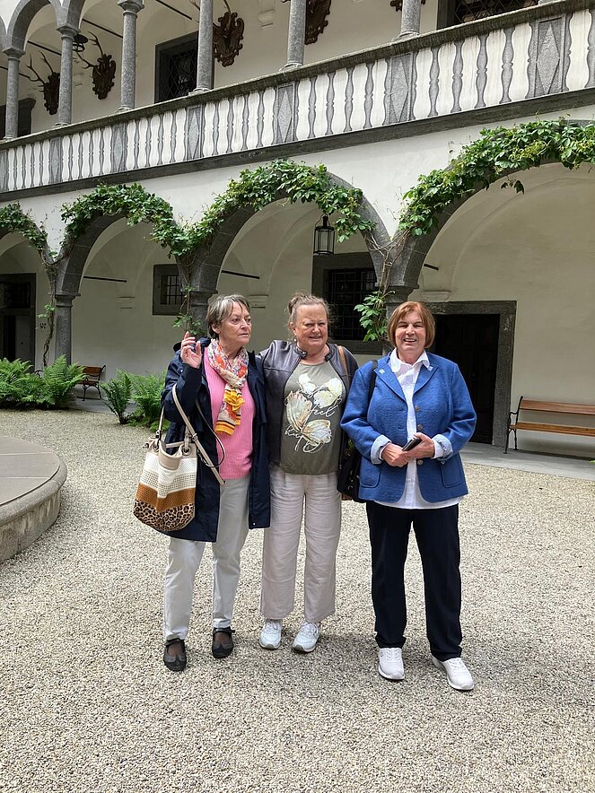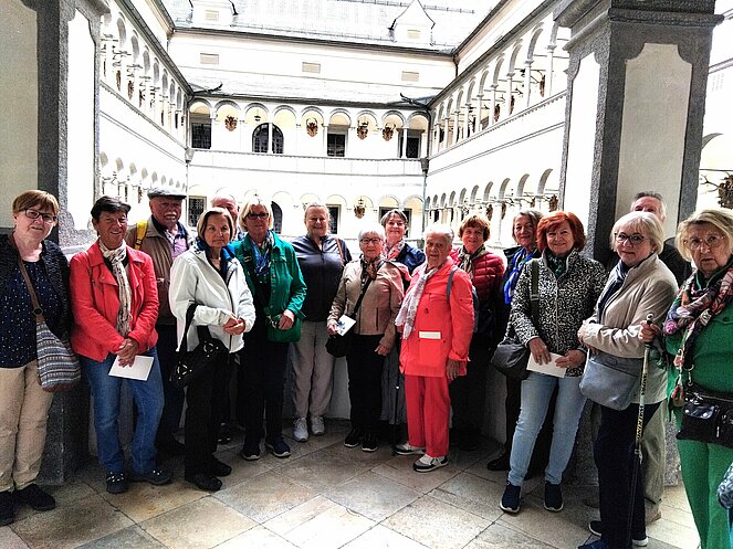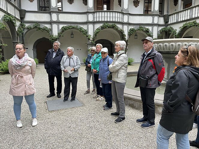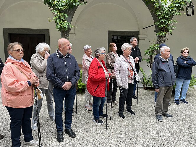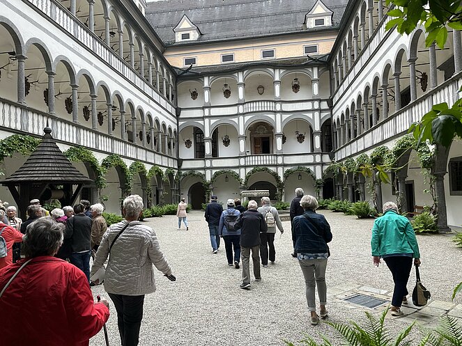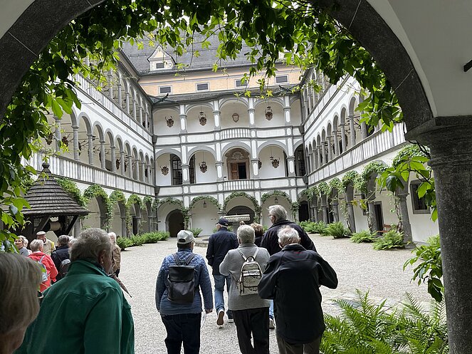 Am 15.5.2025 machten sich 50 Personen des Pensionisten Verband Rottenegg/Walding auf den Weg nach Grein an der Donau. Unser erster Programmpunkt war das Schloss Greinburg. Schon der Anblick des Innenhofes mit seinen Arkaden war umwerfend. Bei einer Führung erfuhren wir viel über die Geschichte und die derzeitigen Besitzer. Bis heute ist das Schloss in Privatbesitz und gehört der Familienstiftung des herzoglichen Hauses Sachsen-Coburg und Gotha. Seine historischen Repräsentationsräume, wie der Große und der Kleine Rittersaal, das Diamantgewölbe, die Sala terrena und der Arkadenhof, sowie das Oberösterreichische Schifffahrtsmuseum sind zu besuchen.