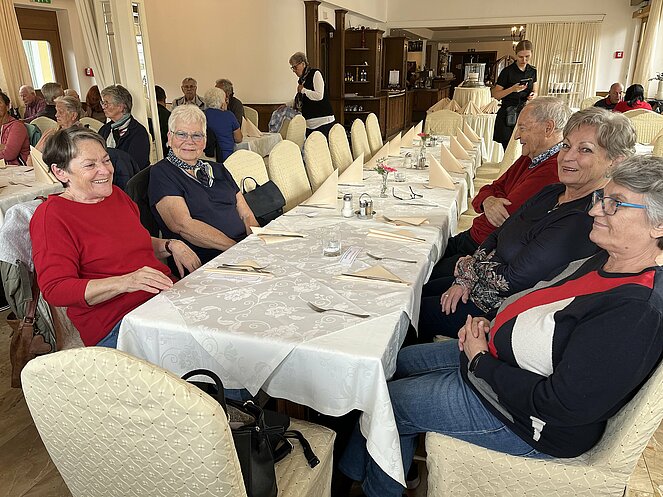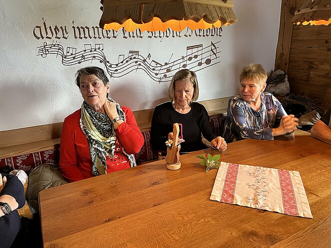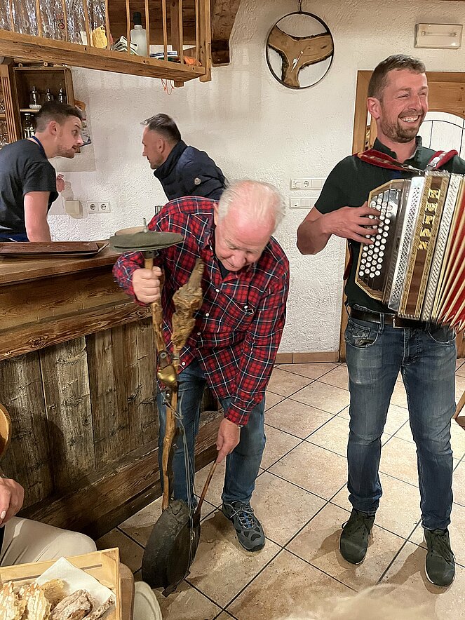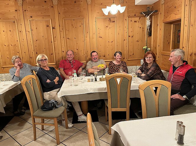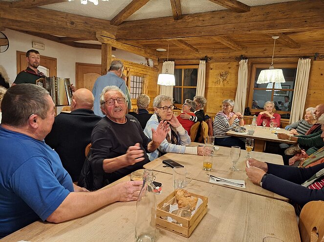 Das Ziel der Reise war der Berggasthof Haidenberg-ein komfortables Anwesen, drinnen wie draußen! Zur Stärkung wurden uns Südtiroler Knödel serviert. Mit Musikeinlagen einiger Musiker wurde uns die Wartezeit auf das Essen verkürzt. Beim Bus verabschiedeten wir uns von unserer örtlichen Reisebegleitung Josefine und Stefan mit einem guten Stamperl Nuss Schnaps. Am Abend wurde uns vom Alleinunterhalter Reini nochmals eingeheizt mit super Oldies.