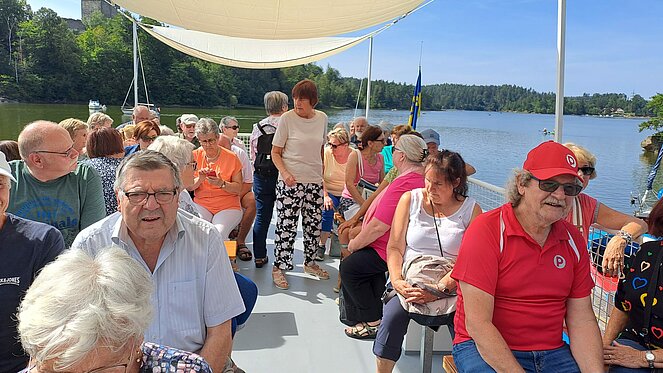 Am 23. August lud die OG Schenkenfelden zum Ausflug und der Bus war mit 50 Gästen voll besetzt. Leider konnten wir nicht alle mitnehmen, wir mussten 7 Personen auf die Warteliste setzen. Ortsgruppen von Oberneukirchen bis Wartberg waren dabei, sogar zwei Gäste aus Deutschland konnten wir begrüßen. Mit dem Bus ging`s nach Gmünd, wo wir in die Waldviertelbahn umstiegen um nach Altnagelberg zu fahren. In der Glashütte Apfelthaler gab`s eine interessante Führung und wir konnten die Glasbläser bei der Arbeit beobachten. Mittags kehrten wir im Gasthaus Schönauer in Schrems ein. Weiter ging es zum Stausee Ottenstein. Dort enterten wir die MS Ottenstein und befuhren damit den großen und kleinen Kamp. Nach Eiskaffee und diversen Mehlspeisen ging`s zurück in die Heimat. Ein gelungener Ausflug und schöner Tag für alle Mitfahrer ging zu Ende und unsere Vorsitzende Gerti Rathwallner wurde vielfach gefragt wann sie den nächsten Ausflug organisiert.