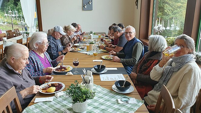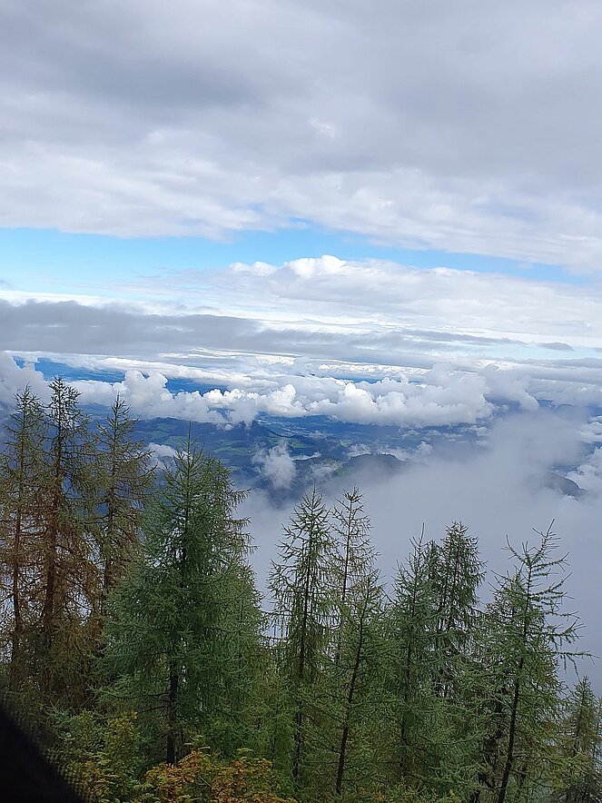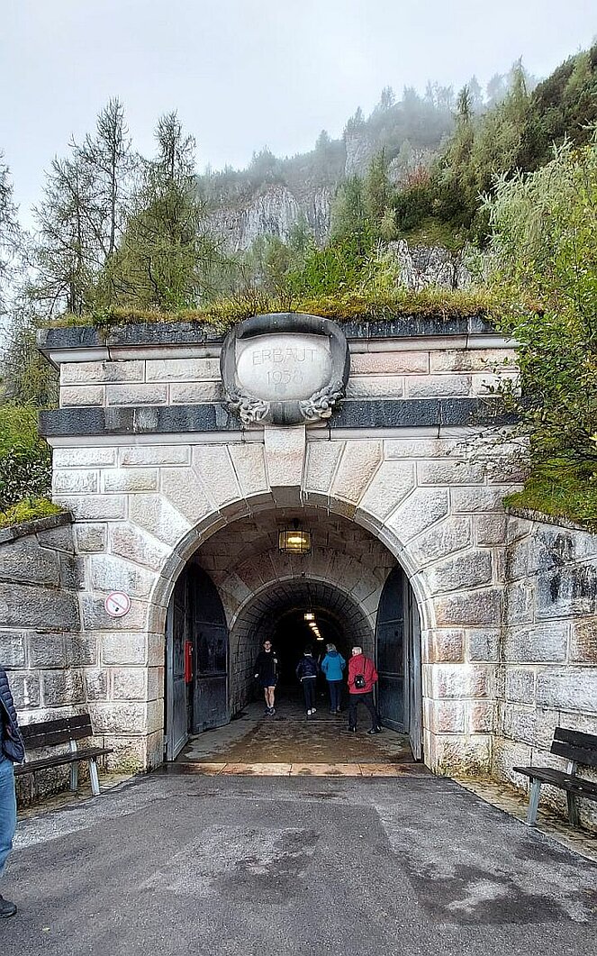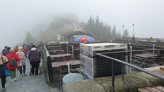 Vom darunter liegenden Parkplatz für Busse stiegen wir in einen sogenannten Kehlsteinbus, der uns zu einem weiteren Parkplatz brachte, um von dort in einem Lift in ein zu einem Gasthaus umgebautes Gebäude, zu fahren. Die Busse werden elektrisch betrieben und sind somit, für diese Gegend passend, sehr umweltfreundlich. Leider herrschte oben zwar kein Regen, aber dichter Nebel, sodass wir nur wenige Meter weit sehen konnten.