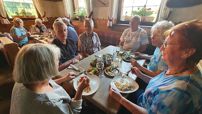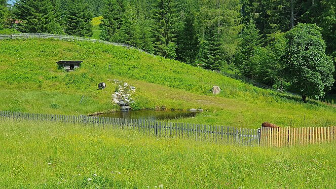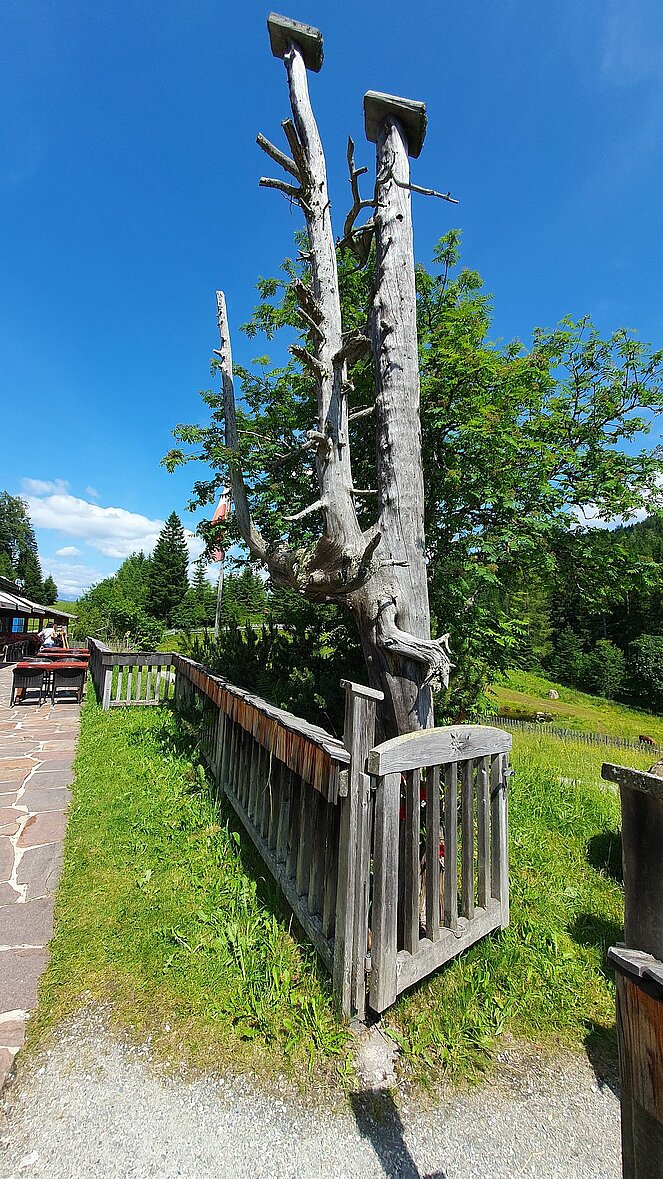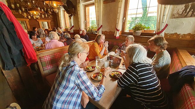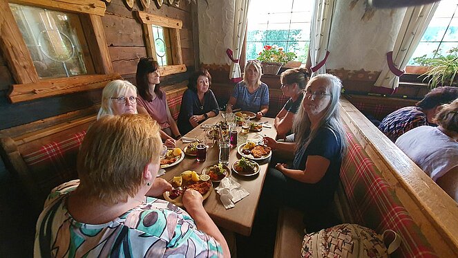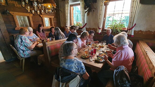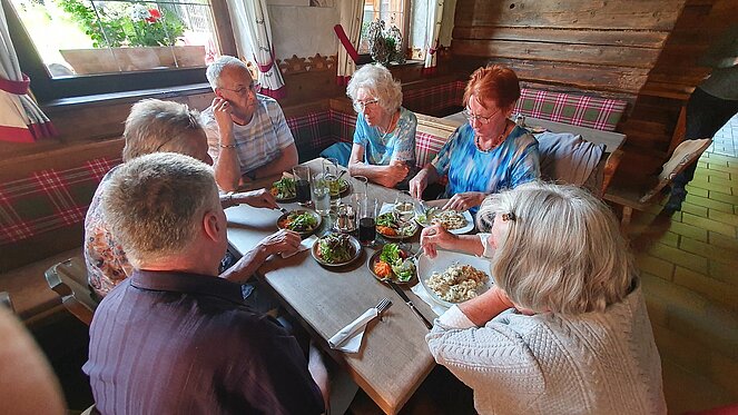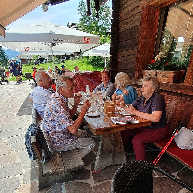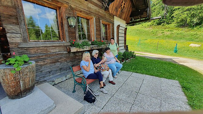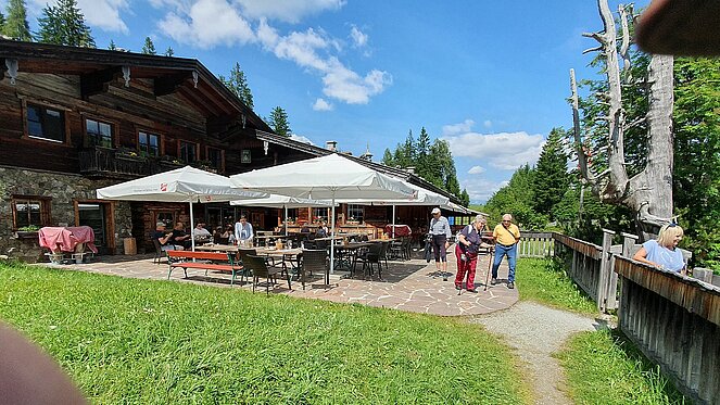 Nach dem schmackhaftes Mittagessen bot sich genug Zeit für kleinere Wanderungen in alle Richtungen. Zu geniessen waren die bergige Aussicht einschließlich eines Blickes auf die Bischofsmütze, Lifttrassen und Seen für die Beschneiung im Winter. Auch ein kleines Museum, direkt neben der Hütte, mit bis zu 300 Jahre alten Geräten aus der Bauernwelt konnte besichtigt werden. Und das alles bei perfektem Wetter.