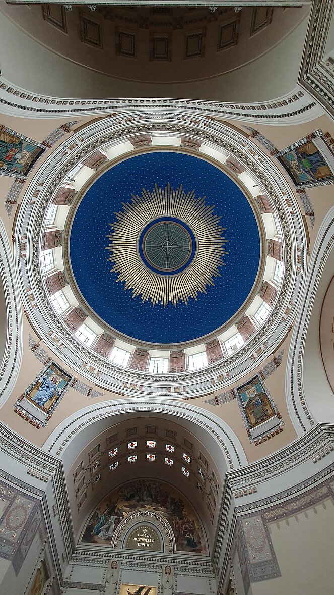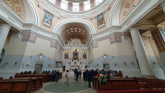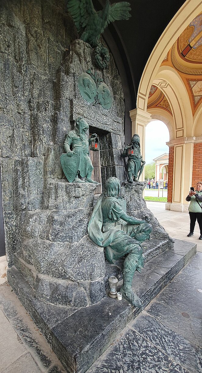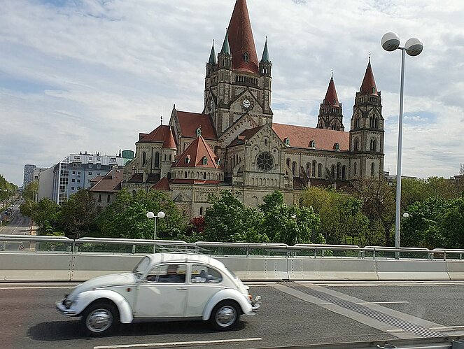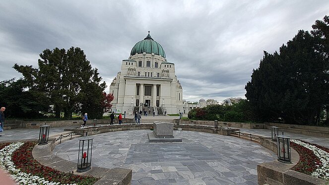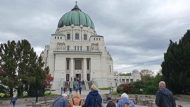 Am Gelände des Zentralfriedhofs befinden sich einige Aufbahrungshallen und die Friedhofskirche. Diese wurde nach Plänen eines jungen, damals unbekannten, aber sehr talentierten Architekten gebaut, der den damals ausgeschriebenen Architekturwettbewerb gewann. Dieser Max Hegele nahm Anleihe bei anderen Kulturen und holte u.a. griechische, ägyptische und natürlich christliche Elemente in die Kirche. Wir erfuhren auch, dass hier 2/3 Sarg- und 1/3 Urnenbestattungen zelebriert werden.