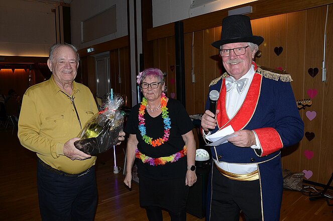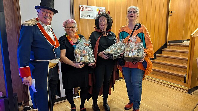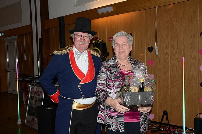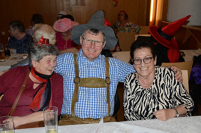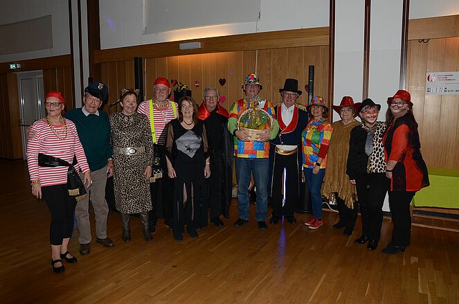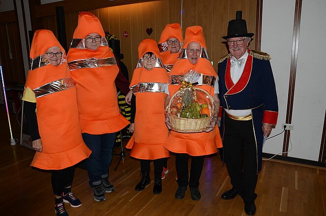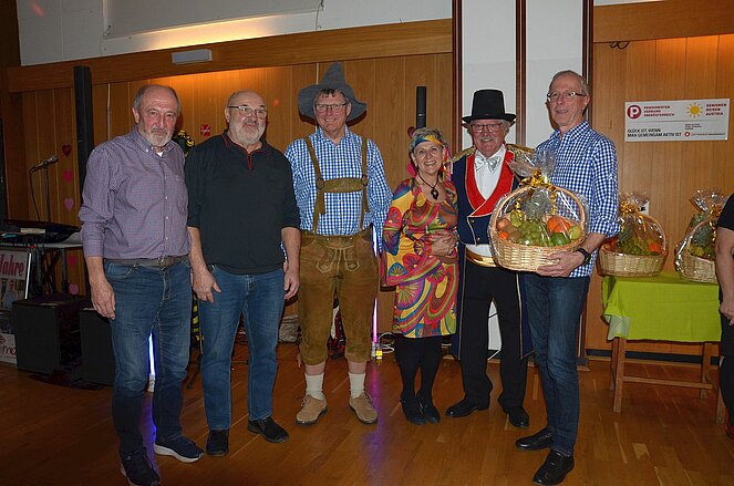 Der Obmann Franz Hackl, ein gut gekleideter Zirkusdirektor moderierte nicht nur die Begrüßung, sondern auch die Prämierung der originellsten Masken. Auch die weitest gereiste und die größte Ortsgruppe unter den Gästen erhielten einen Preis in Form eines Geschenkkorbes. Geschenkkörbe konnten auch beim Schätzspiel an jene übergeben werden, die die Anzahl der Kaffeebohnen in einem durchsichtigen Gefäß erraten bzw. ganz nahe kamen.