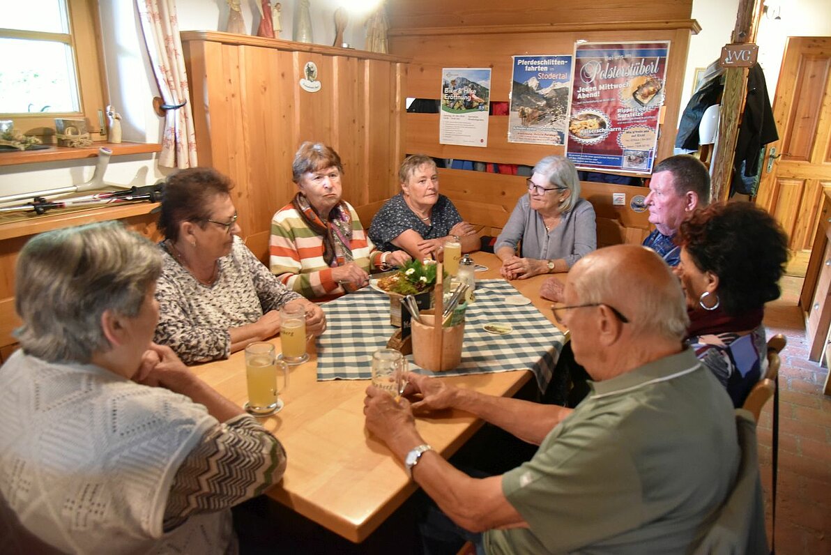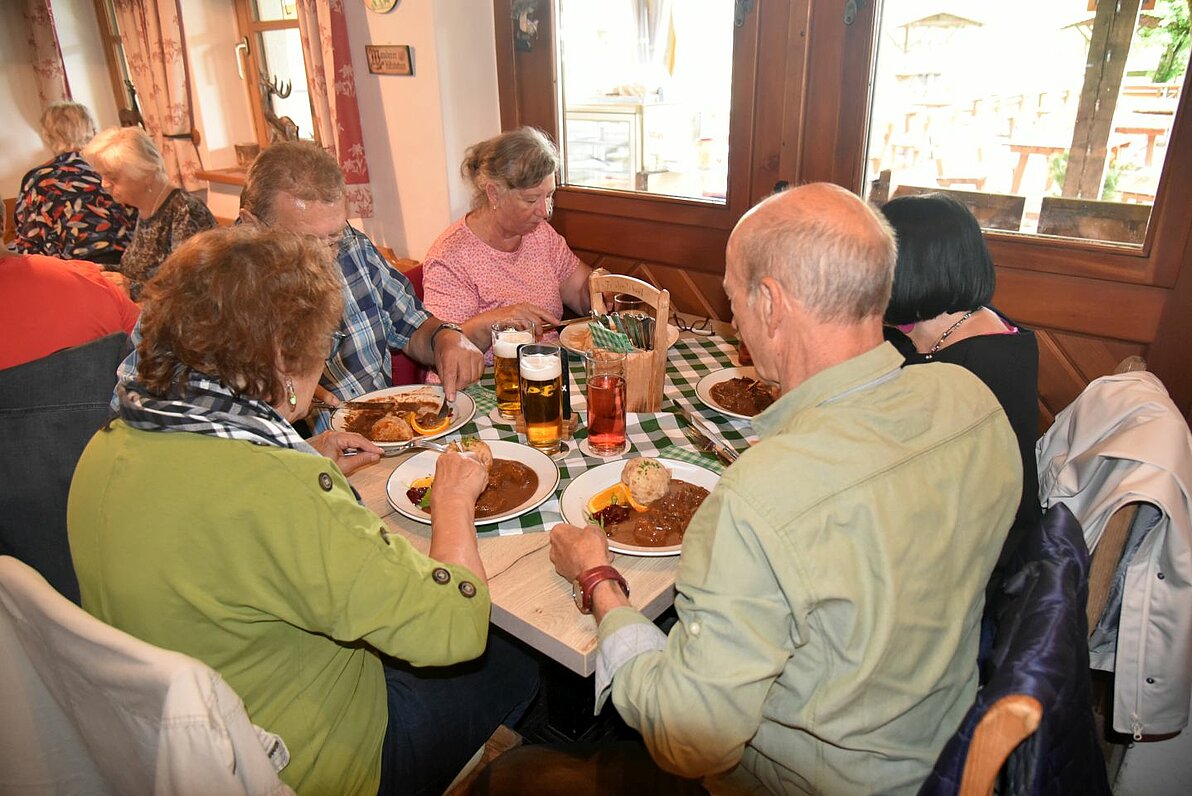 Das Hirschgulasch, Bratl und Nachspeisen - etwas verspätet gegessen wegen einer Wartezeit nach dem Schuhkauf - schmeckten erwähnenswert gut. Nachdem sich wieder alle am Parkplatz Hinterstoder gesammelt hatten, ging die Nachhause-Fahrt über Vorderstoder weiter. Peter Grassnigg, der hier seine Kindheit bis zum 6. Lebensjahr verbrachte, konnte daher über die damaligen Gegebenheiten und Örtlichkeiten eine Menge erzählen.