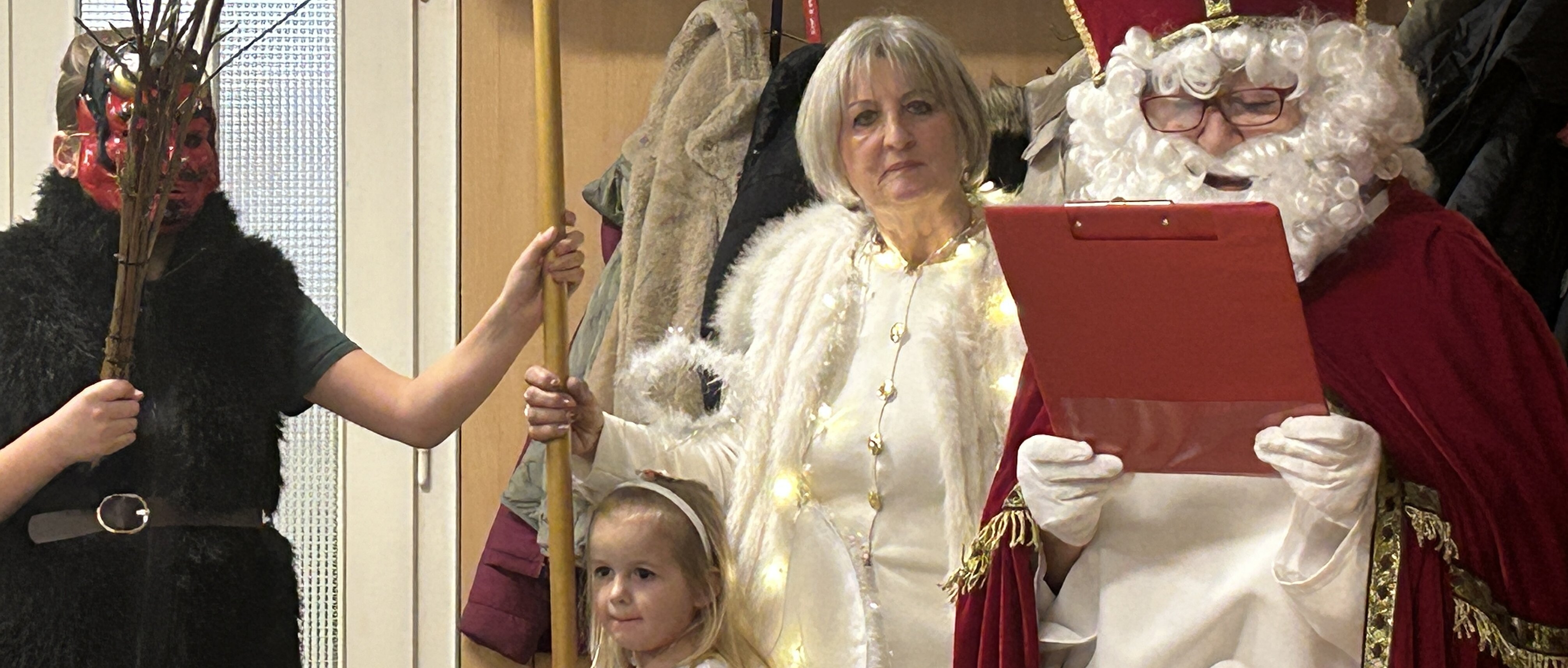 „In meinem Alter, das muss ich euch sagen, sind die vielen Packerl schwer zu tragen. Darum habe ich zwei Engerl und an Krampus mitgenommen, damit alle Leut auch ein Packerl bekommen. Jetzt sind wir da und wir haben uns schon gefreut, den bei den Pensionisten sind immer recht liebe Leut. Die sitzen zusammen bei Kaffee und Kuchen und sagen der ist heut wieder fein, aber ein Glaserl Wein darf‘s auch manchmal sein. Doch leider, werden die Leut immer weniger, das ist nicht schön, dann kann‘s sein, dass die Tagesheimstätte auf einmal wird zu Ende gehen. Darum darf ich euch bitten, kommt‘s wieder öfter her, denn alle bemühen sich so sehr. Gibt’s a Fest in der Jahreszeit, ist a gute Jausen a stets bereit, a Musik zur Unterhaltung spielt, es wird gesungen und gelacht, da ist es oft so, dass ein Wehwehchen keinen Kummer mehr macht. Die Inge bemüht sich sehr, dass es für jeden passt, drum denkts dran , die Ausflüge sind gemütlich und ganz ohne Hast. Drum liebe Leut will ich nicht mehr lange reden und zum besinnlichen Teil übergehen. Meine Engerl schauen wie die Leut sich besinnen und da Krampus wird ein wenig die Rute schwingen. Nun werden alle hoffen, dass der Nikolaus auch was bringt, meine Engerl und ich verteilen die Packerl ganz geschwind. Bevor wir aber wieder gehen, nehmt das was ich gesagt hab a bisserl zu Herzen, denn ohne Zusammensitzen wird so mancher vieles nicht verschmerzen. Wir wünschen euch eine schöne Adventzeit und ein gutes neues Jahr.“