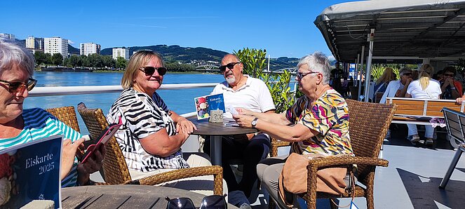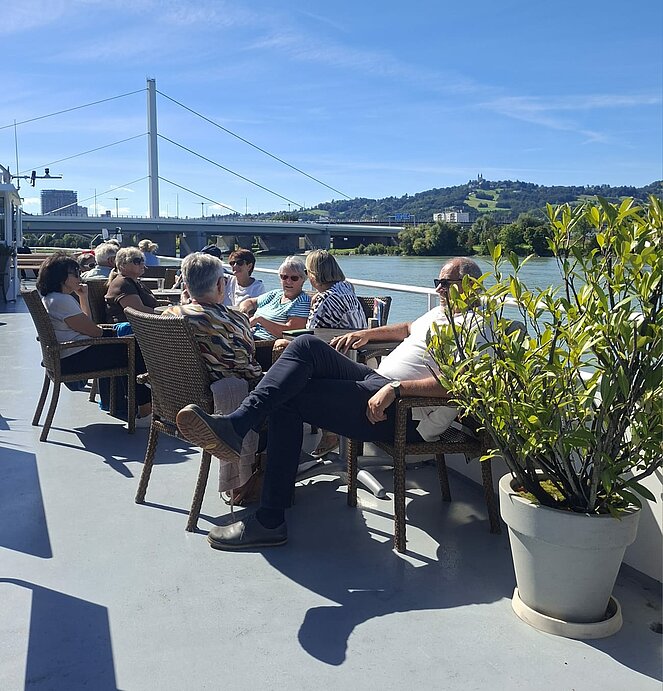 Gut gelaunt fuhren wir weiter nach Linz, wo uns eine Schifffahrt am Hafen erwartete. Vom Wasser aus zeigte sich die Stadt in einem besonderen Licht: die modernen Hafenanlagen im Kontrast zur traditionsreichen Altstadt. Der Linzer Hafen zählt zu den größten Binnenhäfen an der Donau und bot uns spannende Einblicke. „So schön ist die Donau von hier oben!“, schwärmte eine Teilnehmerin, während andere einfach den Blick über das glitzernde Wasser schweifen ließen.