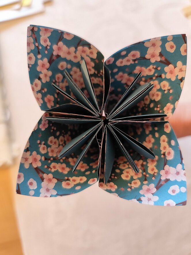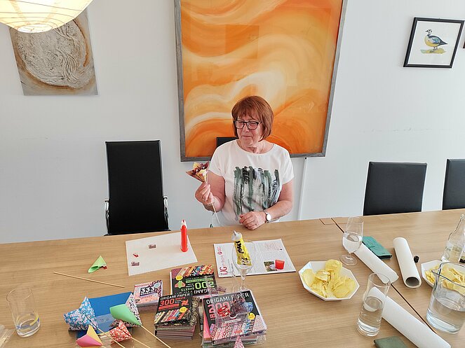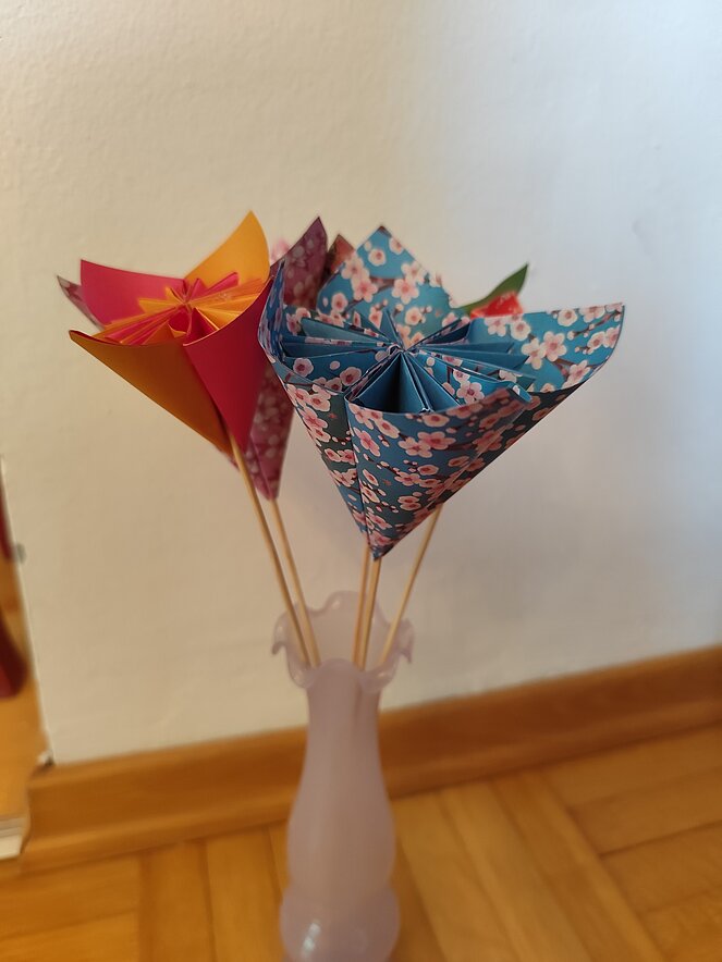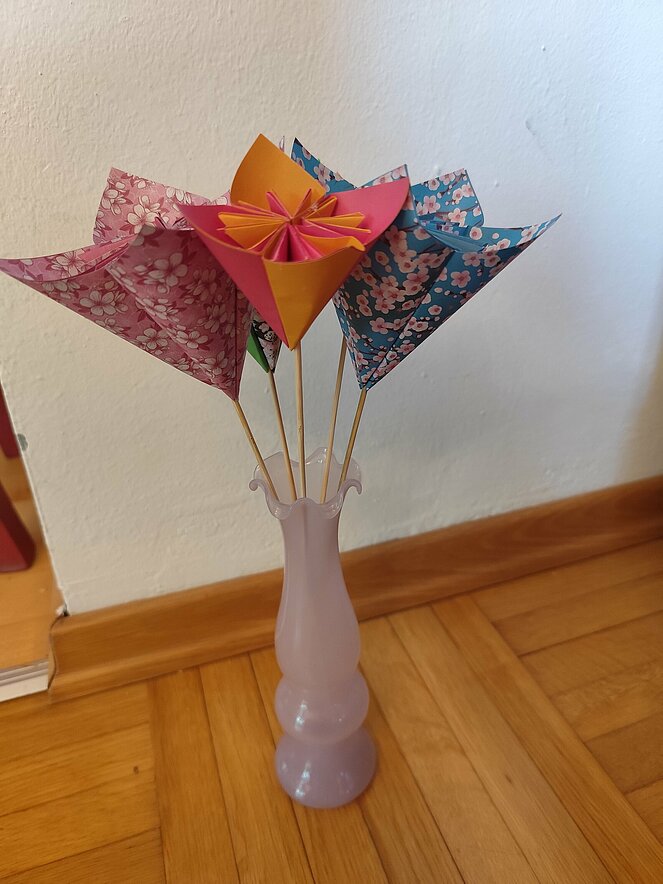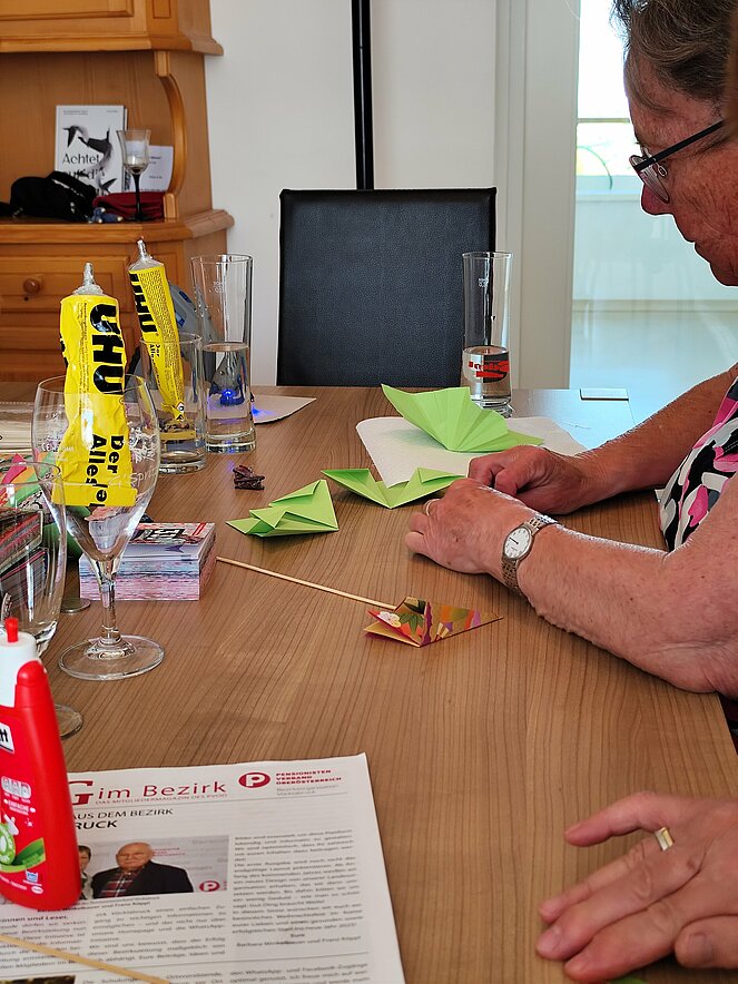 Dieses Mal stellten wir uns die Aufgabe Origami Blüten zu falten. Eine kleine Gruppe faltete und klebte unter der Anleitung von Herta Huemer mit großer Begeisterung. Die Ergebnisse konnten sich sehen lassen und diese Blumen verwelken auch nicht.
