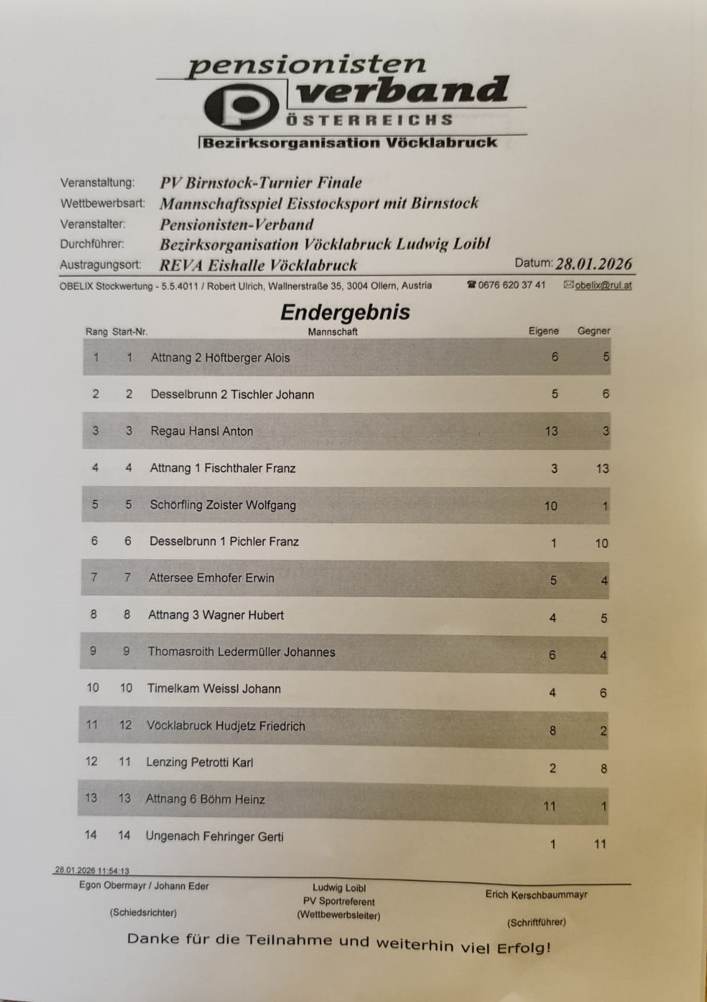 Am 28. Jänner 2026 fand in der REVA-Halle in Vöcklabruck wieder das Birnstock Turnier statt, welches von Herrn Loibl Ludwig ausgeschrieben wurde. Unsere Ortsgruppe nahm mit einer Herrenmannschaft- Ledermüller Hans, Rinortner Rudi, Kronlachner Fredi imd Pimingsdorfer Karl, daran teil.