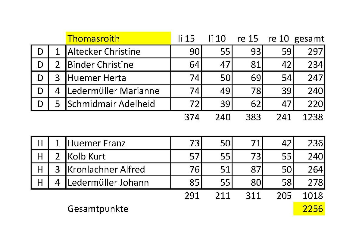 Am Freitag, 17. April 2026 traf sich die Kegelgruppe aus Thomasroith auf der Kegelbahn in Ampflwang um gegen die Mannschaft aus Zell am Pettenfirst anzutreten. Jede Gruppe bestand aus 9 Personen jeweils 5 Damen und 4 Herren. Es wurde ausgemacht, dass nur die reinen Kegel zählen, ohne Zusatzpunkte von Figuren (Modus wie bei der Meisterschaft). Pünktlich um 13:30 begann der Wettkampf. Jeder Teilnehmer musste 15 x scheiben und dann wurden die Bahnen gewechselt. Nach insgesamt 30 Schüben blieb noch Zeit übrig, sodass jeder noch 10 Schübe je Bahn zu absolvieren hatte. Es herrschte eine überaus lockere und faire Atmosphäre. Der Schmäh kam dabei nicht zu kurz. Bei einem tollen Treffer wurde dem Spieler viel Beifall gezollt. Schlußendlich ging die Mannschaft aus Thomasroith als Sieger hervor und die Verlierer mussten die Bratknödel bezahlen, so war es vereinbart. An diesem Nachmittag wurde viel gelacht und gescherzt, trotzdem gab jeder sein bestes.