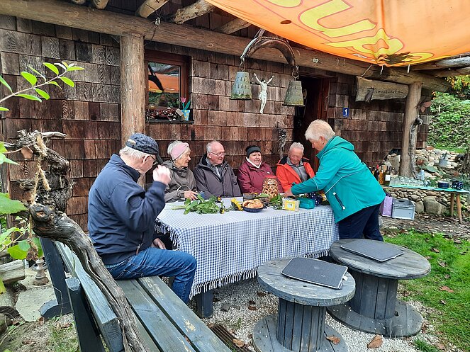 Anschließend durften wir durch den mit Liebe und vielen Besonderheiten gestalteten Obstgarten auf der Moserleitn spazieren. Sehr gut bewirtet mit Kuchen, Tee und Kaffee sowie belegten Brötchen und Bier bzw. Wein ließen wir vor der Hütte "Moserleitn 1" den schönen und interessanten Nachmittag ausklingen.