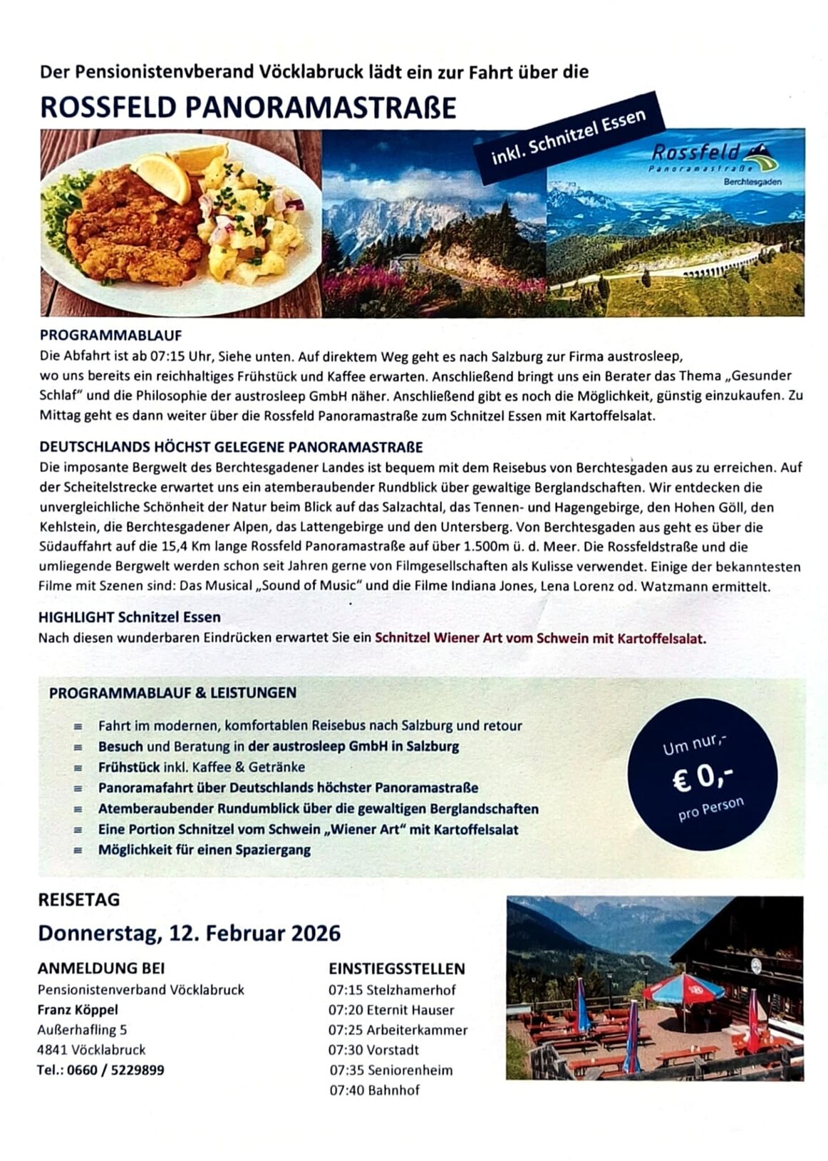 Am Do, 12.02.26 starten wir mit dem Bus nach Salzburg. Dort wird uns bei einem Frühstück das Schlafsystems zum Thema „Gesunder Schlaf“ präsentiert. Anschließend geht’s durch die imposante Bergwelt Berchtesgadens über die Rossfeld Panoramastraße zu einer Berggaststätte, wo uns eine herrliche Aussicht sowie ein Mittagessen erwartet
