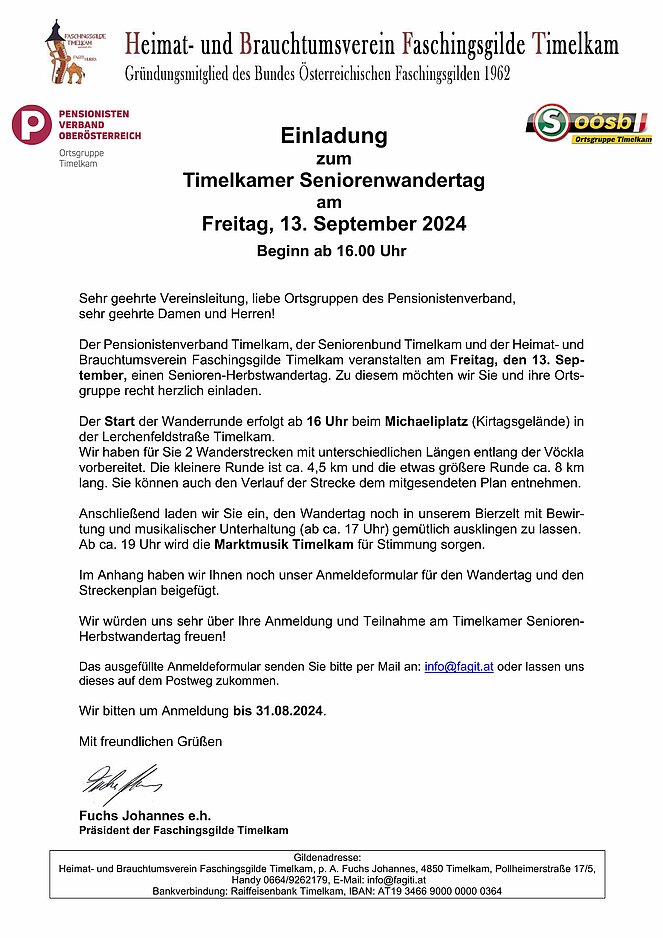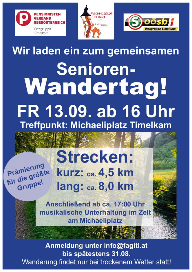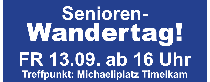 Der Pensionistenverband Timelkam, der Seniorenbund Timelkam und der Heimat- und Brauchtumsverein Faschingsgilde Timelkam veranstalten am Freitag, den 13. September, einen Senioren-Herbstwandertag. Zu diesem möchten wir Sie und ihre Ortsgruppe recht herzlich einladen.