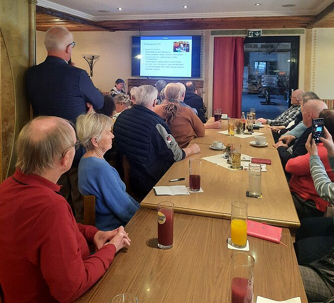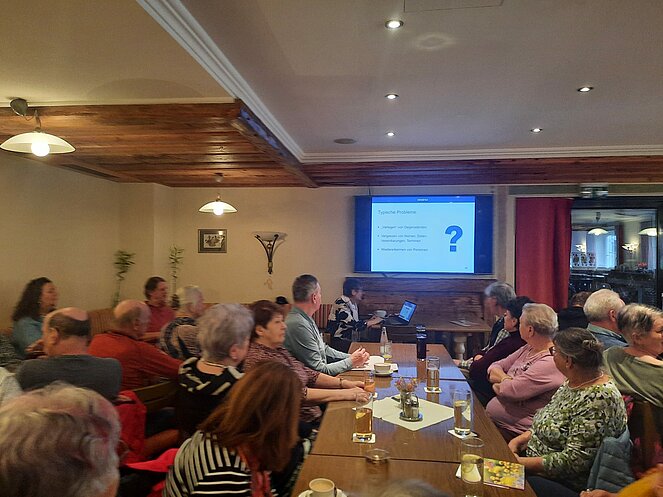 Als Referenten zum Thema DEMENZ fungierten Dr. med. Manfred Lampl und der Praktiker Heinz Dobrink. Die Herren informierten die zahlreichen Anwesenden umfassend über verschiedene Demenzarten und worauf im Alltag zu achten ist. Besprochen wurde der schleichende Verlauf von normaler Vergesslichkeit über die „leichte kognitive Störung“ bis hin zur Demenz. Besonders hervorgehoben wurde, wie man durch gezielte Maßnahmen vorbeugen oder den Verlauf bremsen kann, um eine Verschlechterung hinauszuzögern.