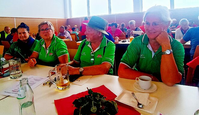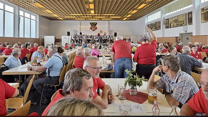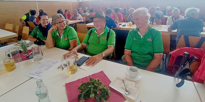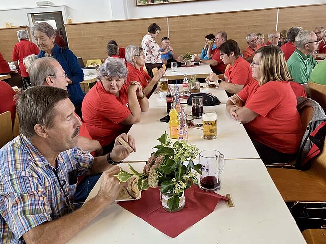 Nach den Wanderungen erwartete die Teilnehmenden ein reichhaltiger Mittagstisch im Kulturzentrum. Es gab Schopf mit Kartoffelsalat, Bratwürsten; alternativ standen Gemüselaibchen bereit. Auch Kaffee und Kuchen warteten auf die Anwesenden. Die musikalische Umrahmung begann um 11:30 Uhr und sorgte ebenfalls für eine angenehme Stimmung. Bei dieser guten Bewirtung nutzten viele die Gelegenheit, sich in geselliger Runde auszutauschen und den Vormittag in gemütlicher Atmosphäre ausklingen zu lassen. Die Verpflegung wurde von allen Seiten sehr gelobt und trug wesentlich zum gelungenen Charakter der Veranstaltung bei.