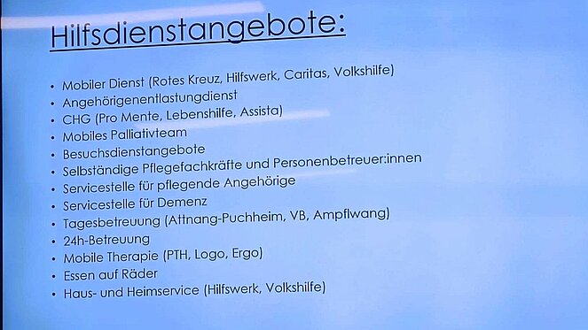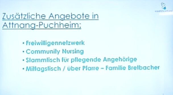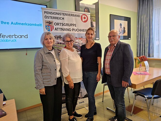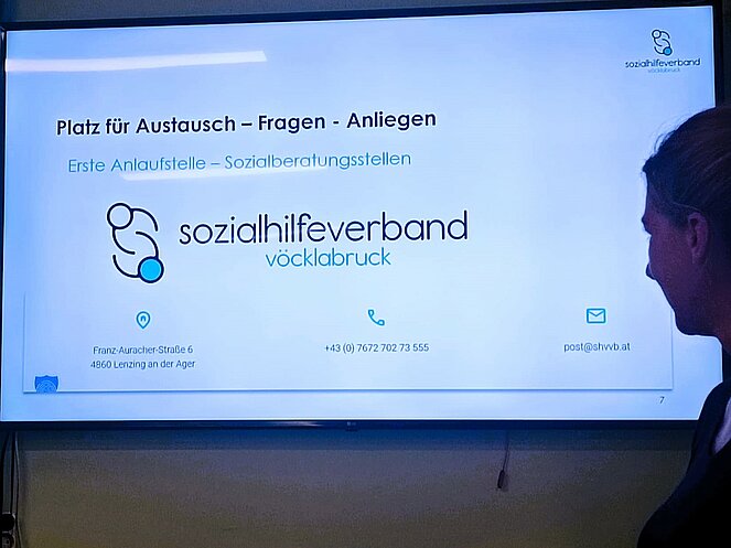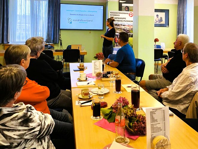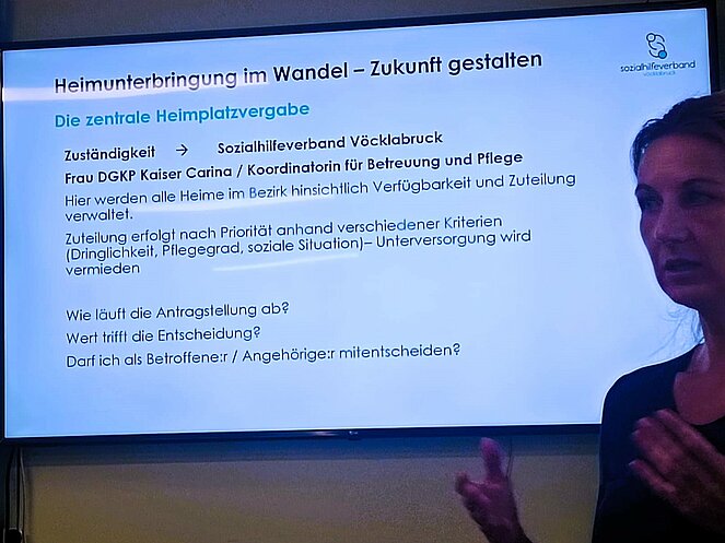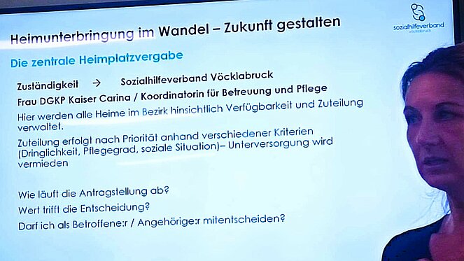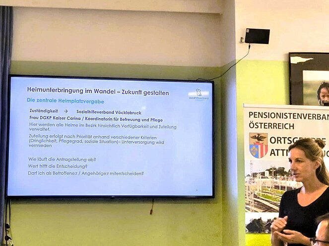Als Referentin zum Thema Pflege konnte die diplomierte Gesundheits- und Krankenpflegerin Christine Brandner, tätig im Bereich Gemeindeschwester (Community Nursing), gewonnen werden. Sie informierte umfassend über den Sozialhilfeverband Vöcklabruck – seine Leistungen, Zuständigkeiten und Hilfsangebote. Dabei ging sie unter anderem auf praktische Fragen ein wie: Wer kann einen Antrag auf Pflegegeld stellen? Wer unterstützt mich dabei? und vieles mehr.