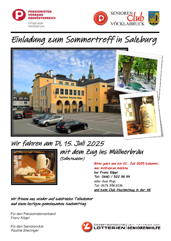 Wir treffen uns am Di, 15. Juli am Bahnhof Vöcklabruck und los geht´s nach Salzburg und freuen uns auf ein gutes Bierchen und a gschmackige Jausn im riesigen Gastgarten des Augustiner-Bräu´s.