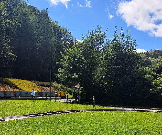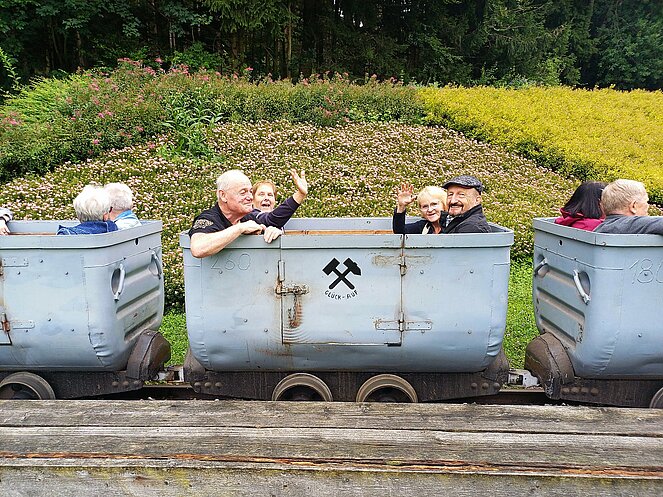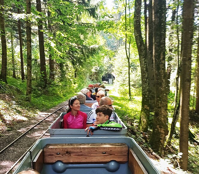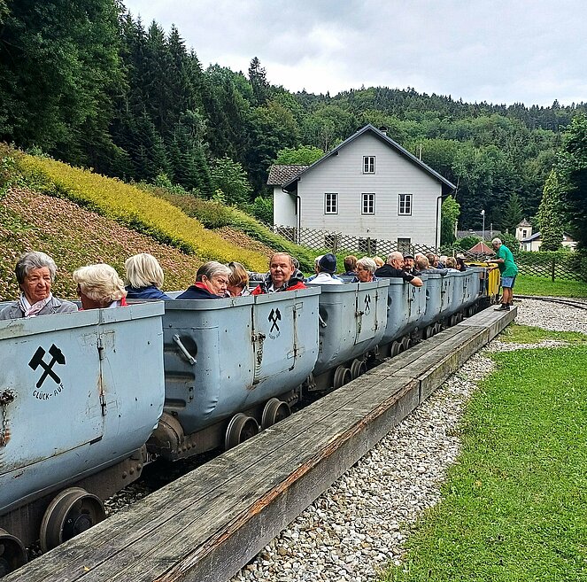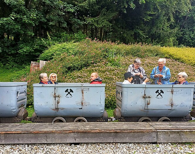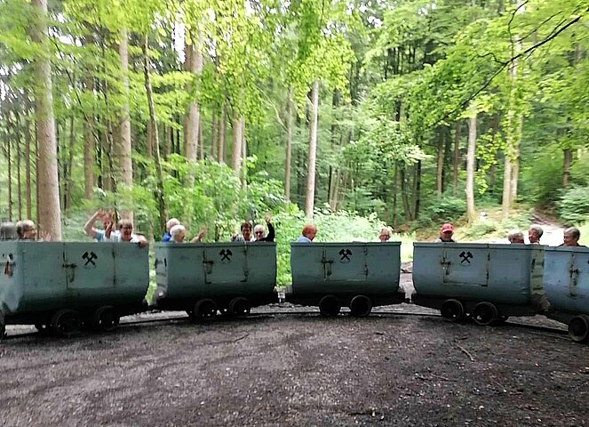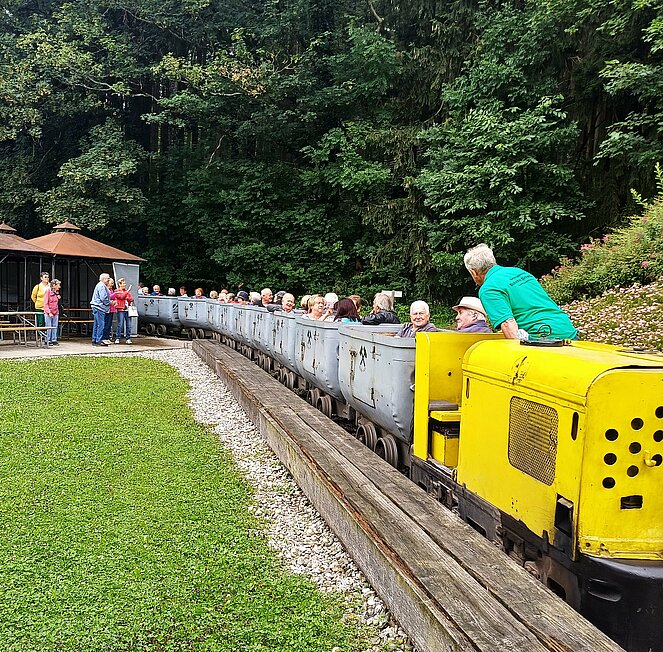 Dort rumpelten dann zwei Gruppen in den von einer Diesellok gezogenen Grubenhunten über den 3,5 km langen Rundkurs durch einen kleinen Schaustollen durch den Hausruckwald und folgten der Spur des „Schwarzes Goldes“ genannten Kohle.