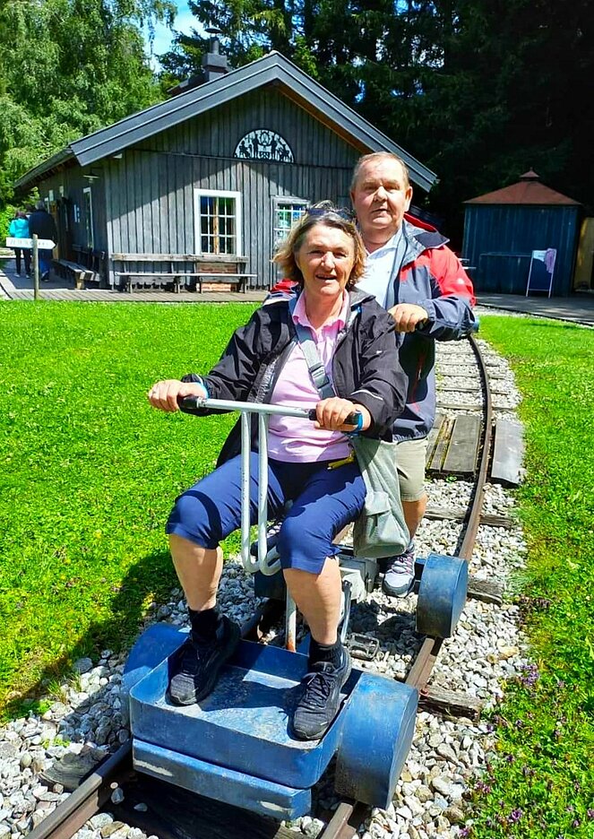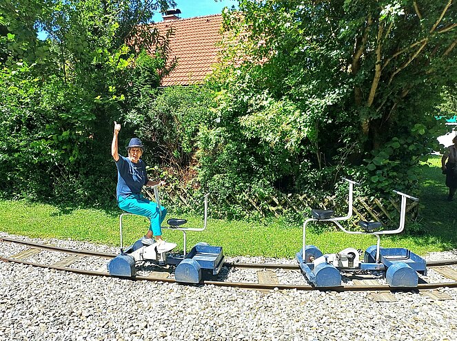 Fahrrad-Draisine über die Schienen der ehemaligen Kohlebahn.