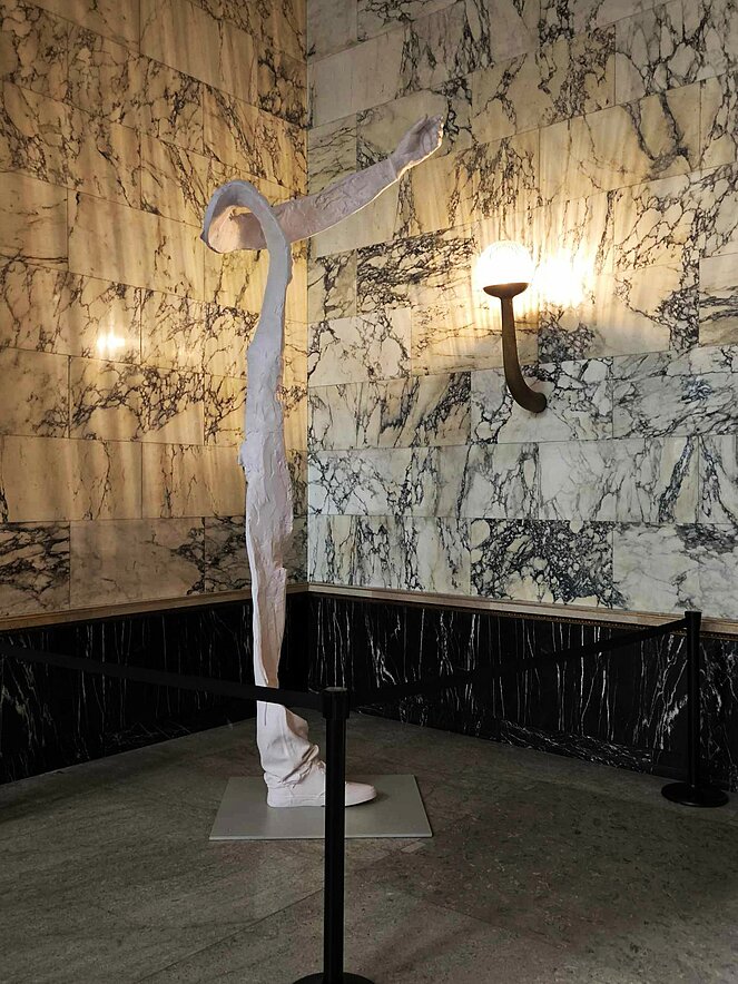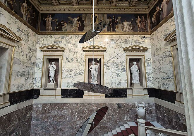 Dort angekommen erwartete die wissbegierige Gruppe eine Führung durch das neu umgebaute Haus. Hinter dem Pallas-Athene-Brunnen ging´s erstmal durch den Haupteingang zur elektronischen Registrierung sowie Sicherheitskontrolle ins Demokratikum, dem neu geschaffenen Besucher/innenbereich. Hier wurden wir freundlich begrüßt, in zwei Gruppen geteilt und mit Kopfhörern ausgestattet.