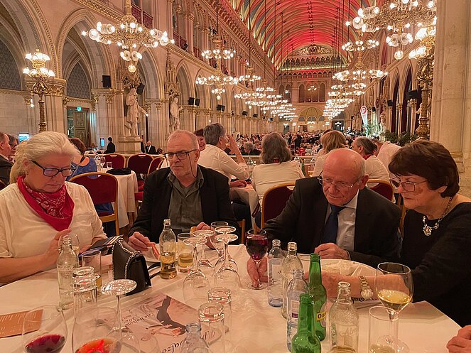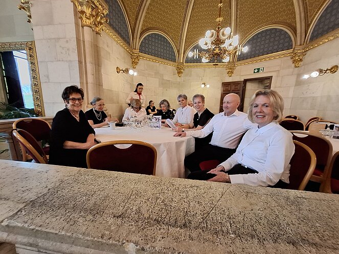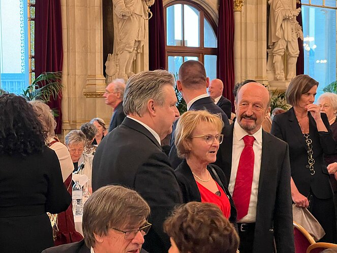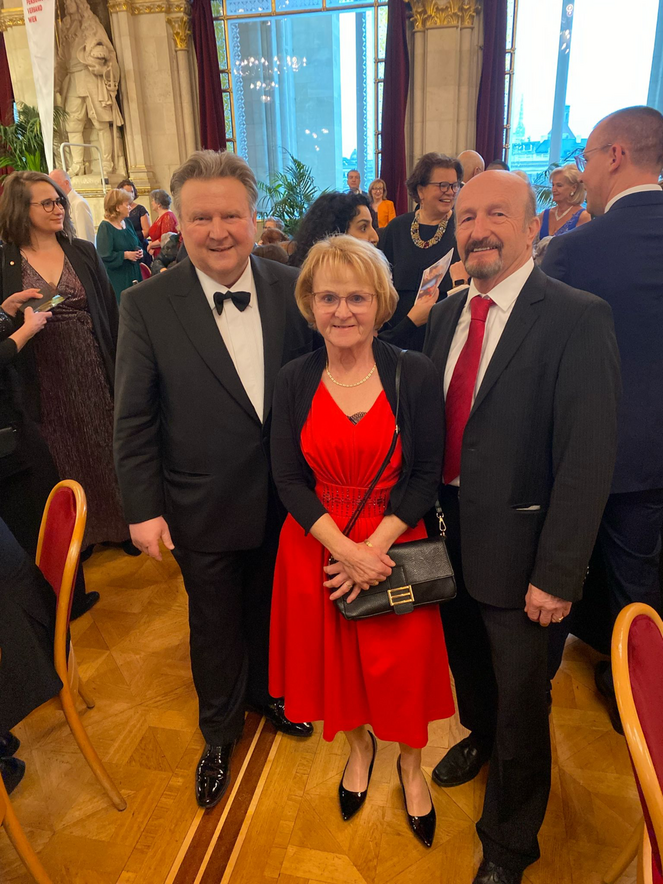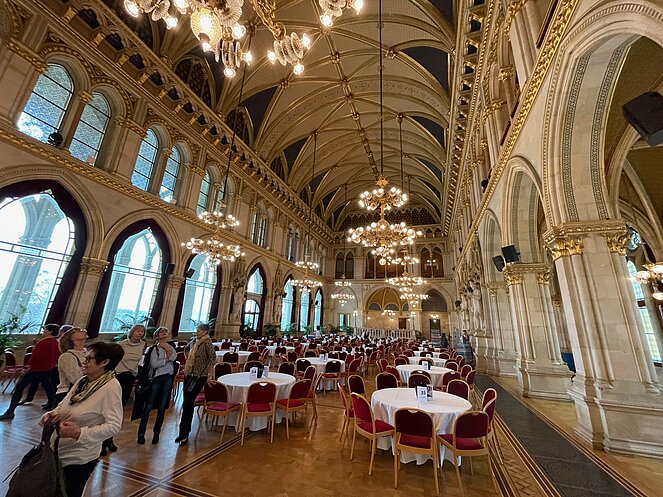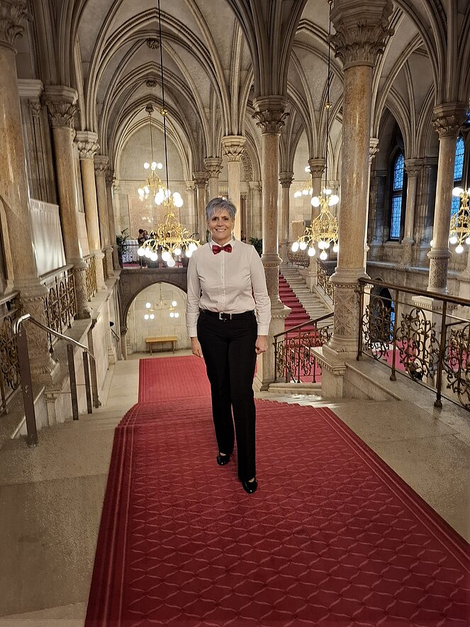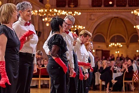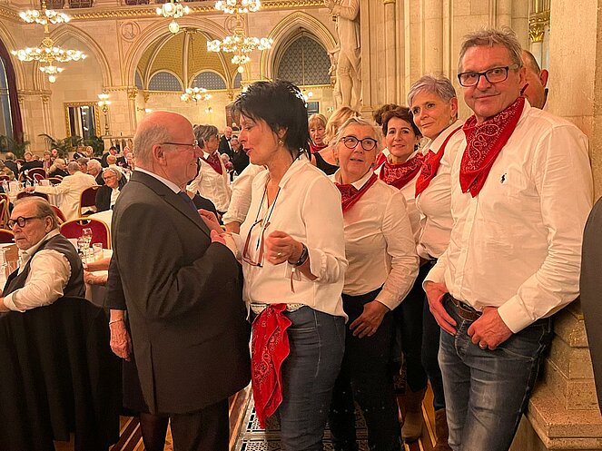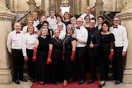 Pünktlich um 16:00 Uhr zog die Gruppe in den prunkvollen Festsaal ein und eröffnete den Ball zusammen mit Tänzerinnen und Tänzern der Tanzschule mit einer traditionellen Quadrille. Im Anschluss begrüßte Bürgermeister Ludwig die Anwesenden mit einer feierlichen Festansprache, bevor der allgemeine Walzer den Start in den Tanznachmittag markierte. Die Atmosphäre im prachtvollen Festsaal des Wiener Rathauses war von Freude, Eleganz und Gemeinschaftsgeist geprägt – ein Ambiente, das sich auch in den vielen stimmungsvollen Momentaufnahmen auf der Feststiege widerspiegelte.