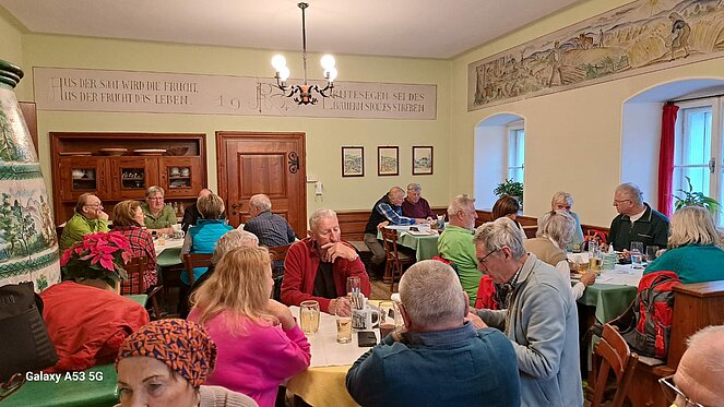 Der anhaltende Nebel verdeckte die schöne Aussicht, zauberte aber auch stimmungsvolle Bilder. Der Weg, kurzfristig schwierig zu gehen, da von den Schneeresten sehr eisig, führte an einem Aussichtsbankerl vorbei auf den kleinen Gipfel mit seinem liebevoll gestalteten Gipfelkreuz und anschließen wieder zurück zum Ausgangspunkt. Der gemeinsame Abschluss fand im Gasthaus Kranichsteg statt, bei Kesselheißen und Wildbeuschel wo auch auf den 80ier von Josef Nöbauer angestoßen wurde.