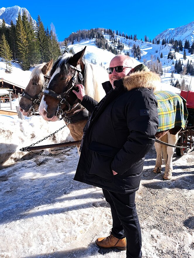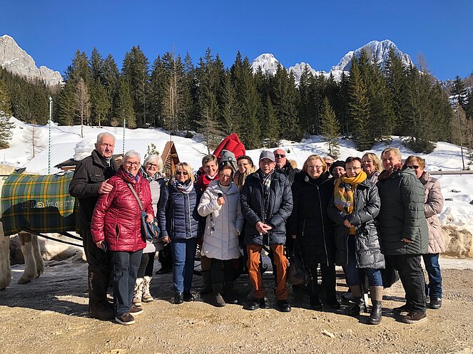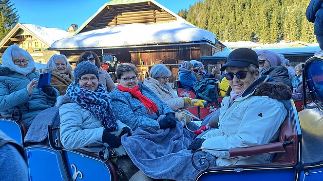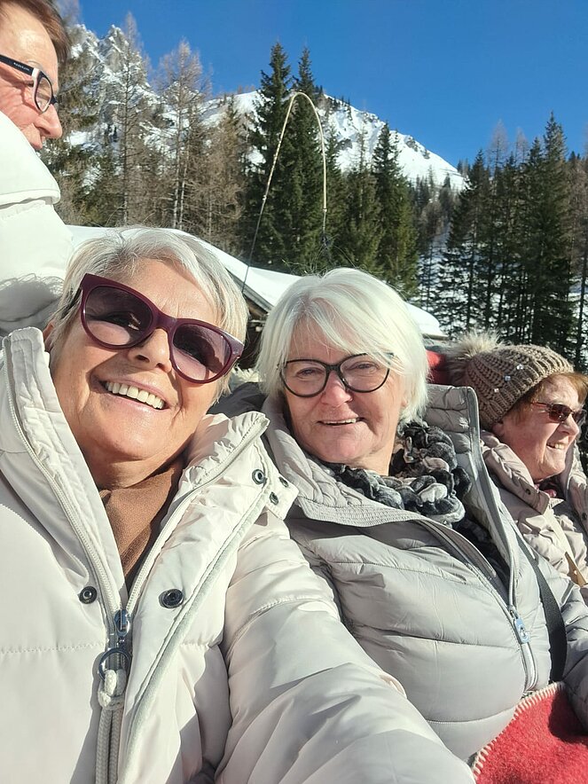 Das Highlight war die Fahrt mit dem Pferdeschlitten. Natürlich kam auch die Kulinarik auf der Alm nicht zu kurz. Ein Verdauungsspaziergang bei Traumwetter und die Rückfahrt von der Alm mit dem Pferdeschlitten nach Filzmoos mit Einkehr zu Kaffee und Kuchen bildeten den Abschluss dieses wunderbaren Tages.