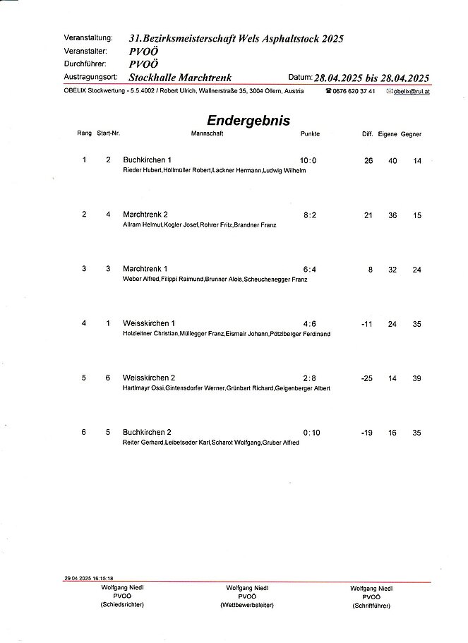 Hier sind die Ergebnisliste und Foto der 3 Platzierten unserer Bezirksmeisterschaft im ASPHALTSTOCKSCHIESSEN, die am Montag 28.4. erfolgreich durchgeführt wurde.