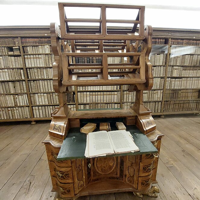 Eine besondere Tischlerarbeit ist das Bücher-Drehpult, das als Unterbau einen Schreibtisch hat.