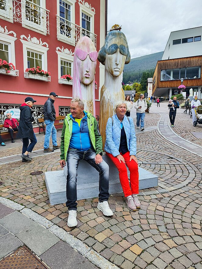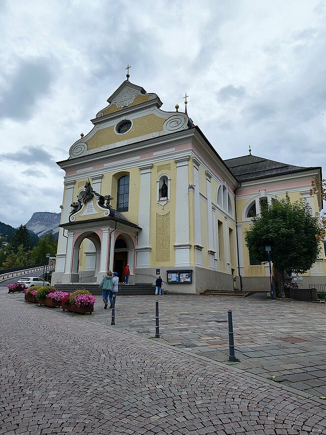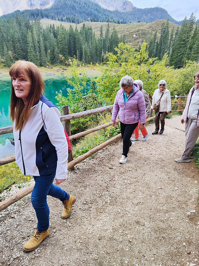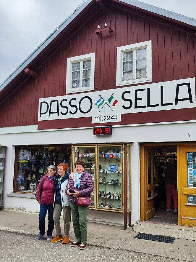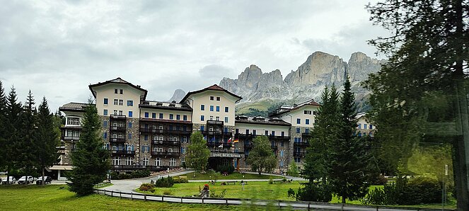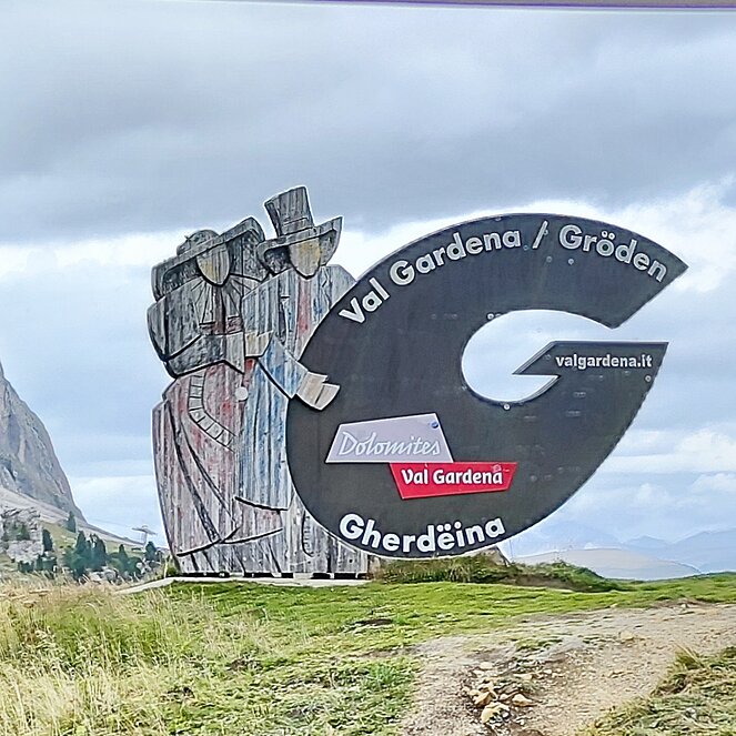 Am Dienstag fuhren wir über Welschnofen zum "Märchensee der Dolomiten" dem Karersee, der umgeben ist von den majestätischen Gipfeln der Dolomiten. Weiter ging die Fahrt über den Karerpass nach Vigo di Fassa und Canazei. Leider waren die Berggipfel und das Sellaplateau mit dem Piz Boe wolkenverhangen. Die Passstraße über das Sellajoch verbindet das Fassatal mit dem Grödnertal, wo wir in St. Ulrich eine Mittagspause einlegten. Die Fußgängerzone in St. Ulrich, die die Pfarrkirche zum Hl. Ulrich mit der Antoniuskirche verbindet, wird als die schönste Einkaufsstraße in den Dolomiten beschrieben. Hier befindet sich das Zentrum der Grödener Holzschnitzkunst.
