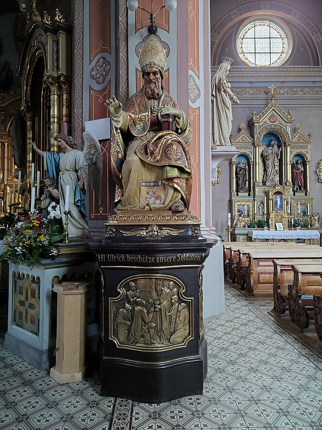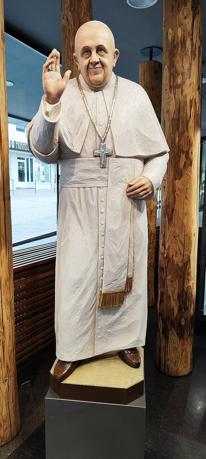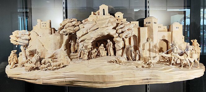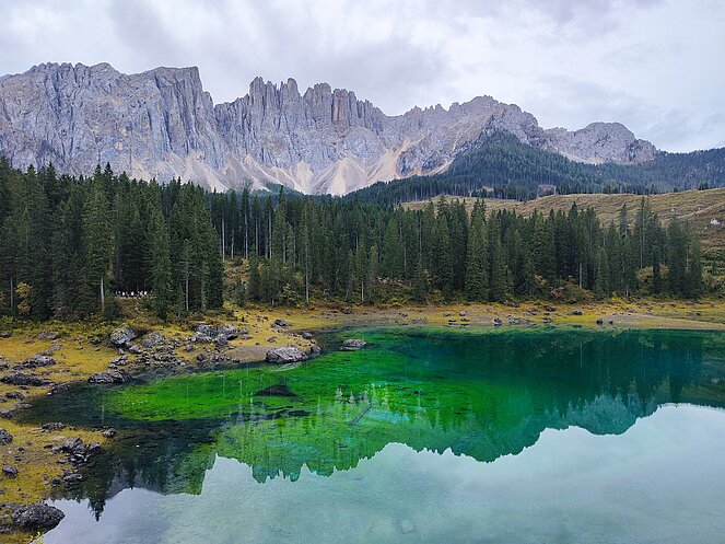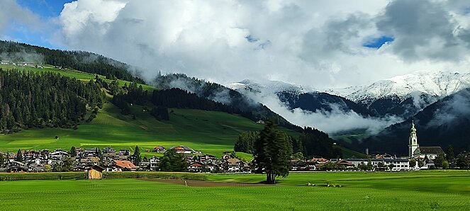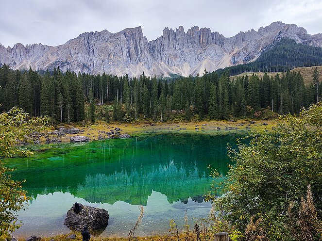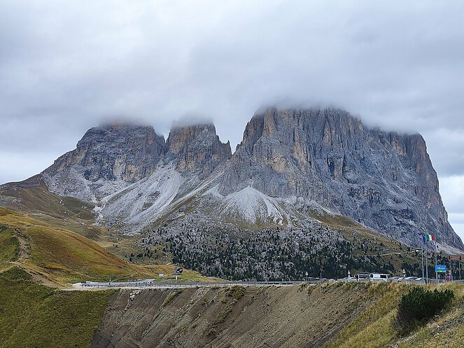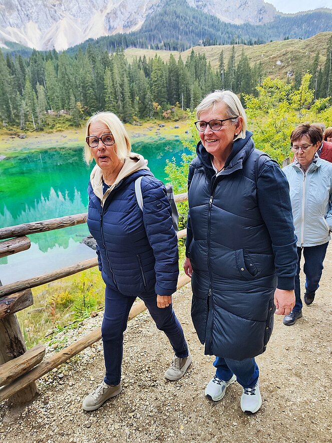 Am Dienstag fuhren wir über Welschnofen zum "Märchensee der Dolomiten" dem Karersee, der umgeben ist von den majestätischen Gipfeln der Dolomiten. Weiter ging die Fahrt über den Karerpass nach Vigo di Fassa und Canazei. Leider waren die Berggipfel und das Sellaplateau mit dem Piz Boe wolkenverhangen. Die Passstraße über das Sellajoch verbindet das Fassatal mit dem Grödnertal, wo wir in St. Ulrich eine Mittagspause einlegten. Die Fußgängerzone in St. Ulrich, die die Pfarrkirche zum Hl. Ulrich mit der Antoniuskirche verbindet, wird als die schönste Einkaufsstraße in den Dolomiten beschrieben. Hier befindet sich das Zentrum der Grödener Holzschnitzkunst.