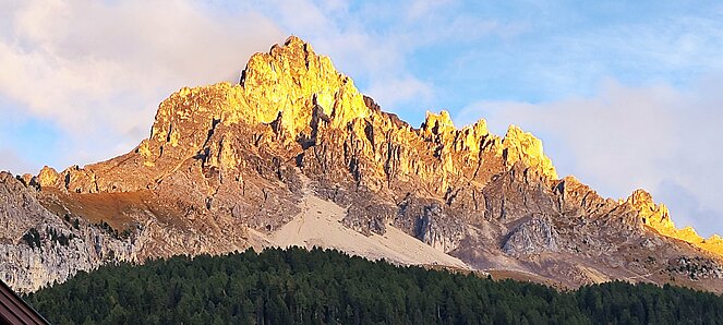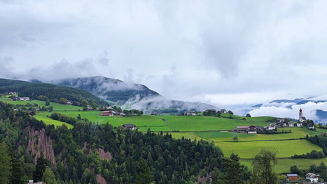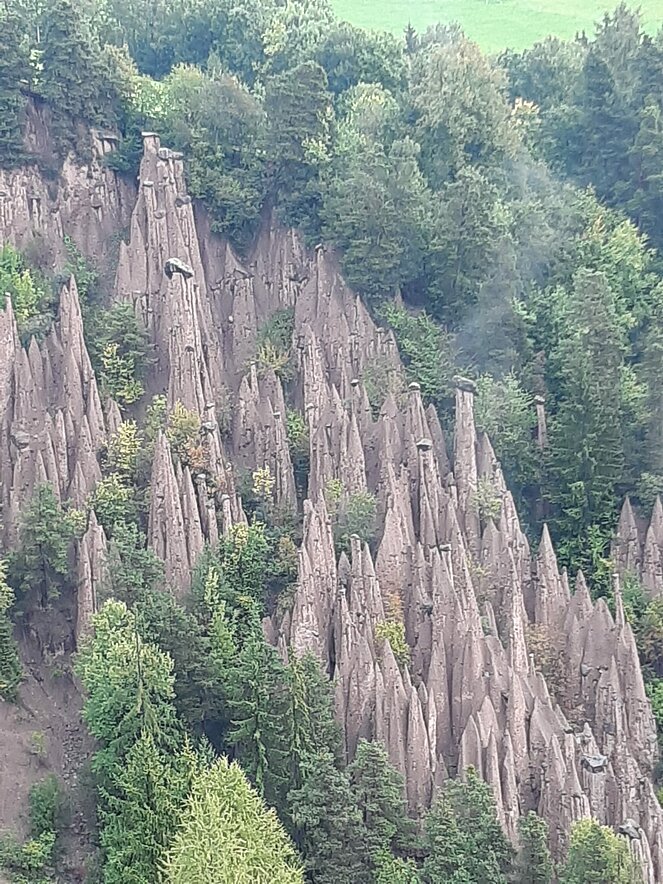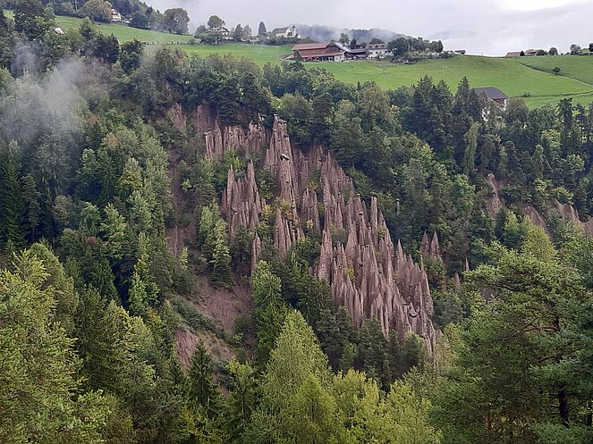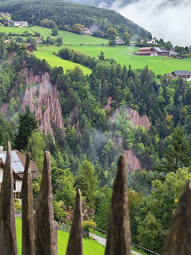 Am dritten Tag ging es nach Bozen und auf der Panoramastraße auf das Sonnenplateau Ritten nach Oberbozen. Nebel und teilweise leichter Regen verhinderte bei der Bahnfahrt nach Klobenstein den Ausblick auf die Dolomiten. Von Klobenstein wanderte ein Teil unserer Reisegruppe auf dem "immer ebenen Weg" (Aussage Reiseleiter) zu den Erdpyramiden. Dies sind die höchsten und schönsten Erdpyramiden Europas. Bei der Rückfahrt zum Hotel hatten wir noch einen kurzen Kaffee-Halt in Bozen. Am Abend ging es dann noch hoch her. Drei einheimische Musikanten spielten zum Tanz auf und die vielen Witze strapazierten die Lachmuskeln.