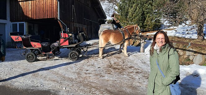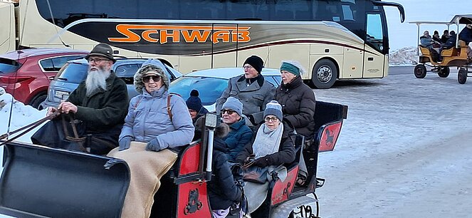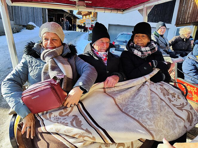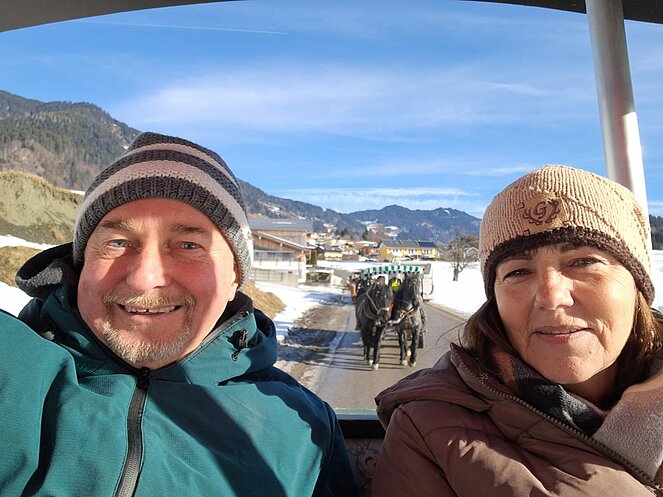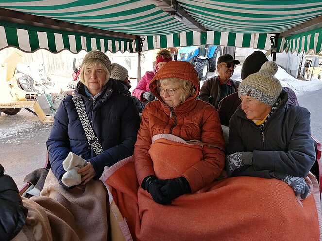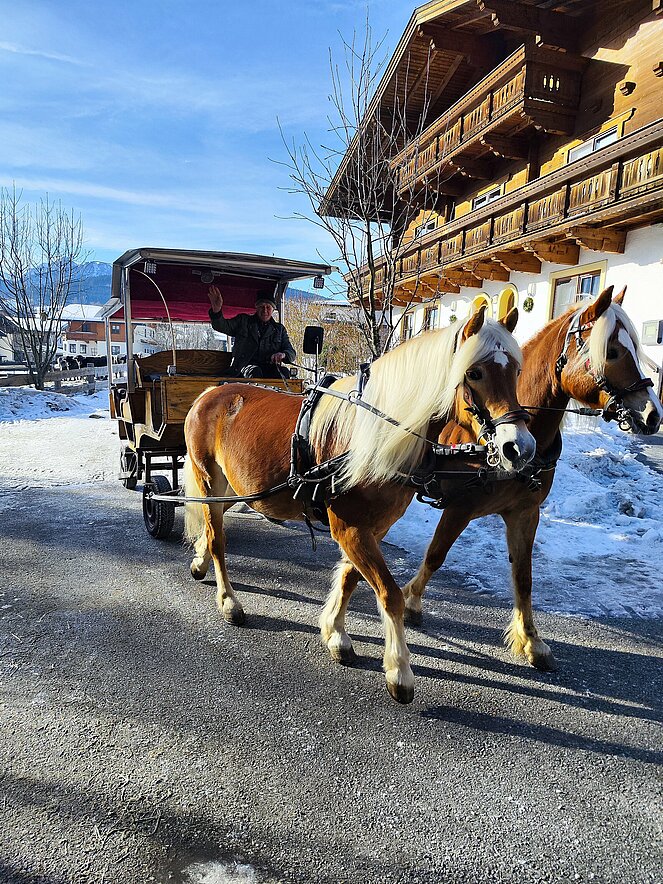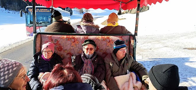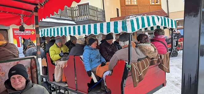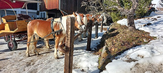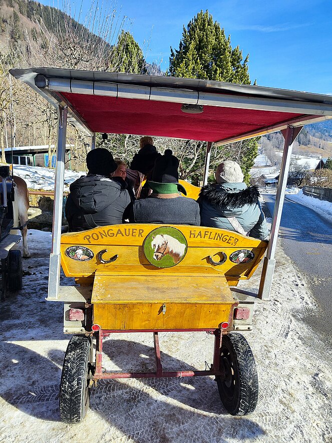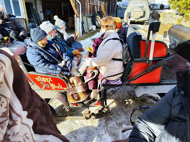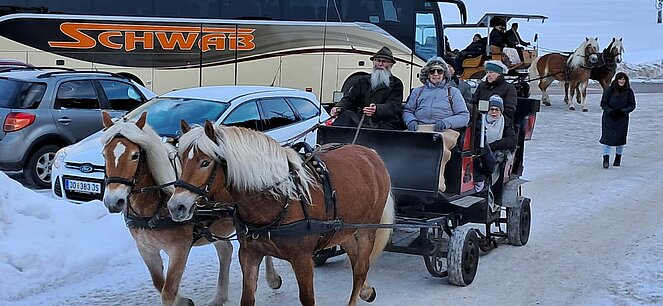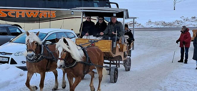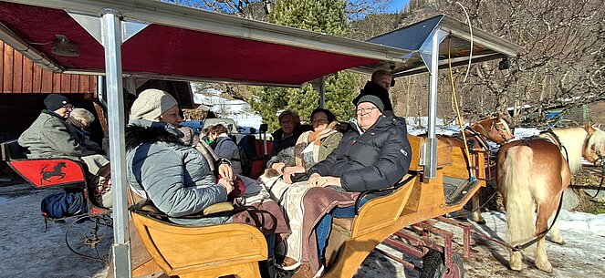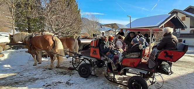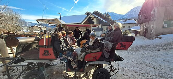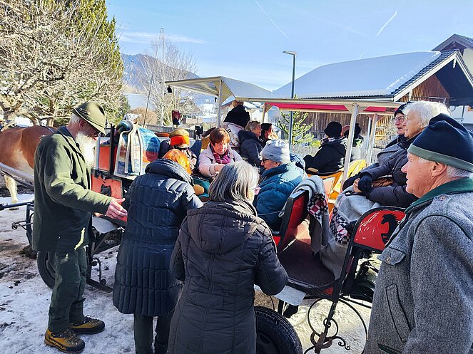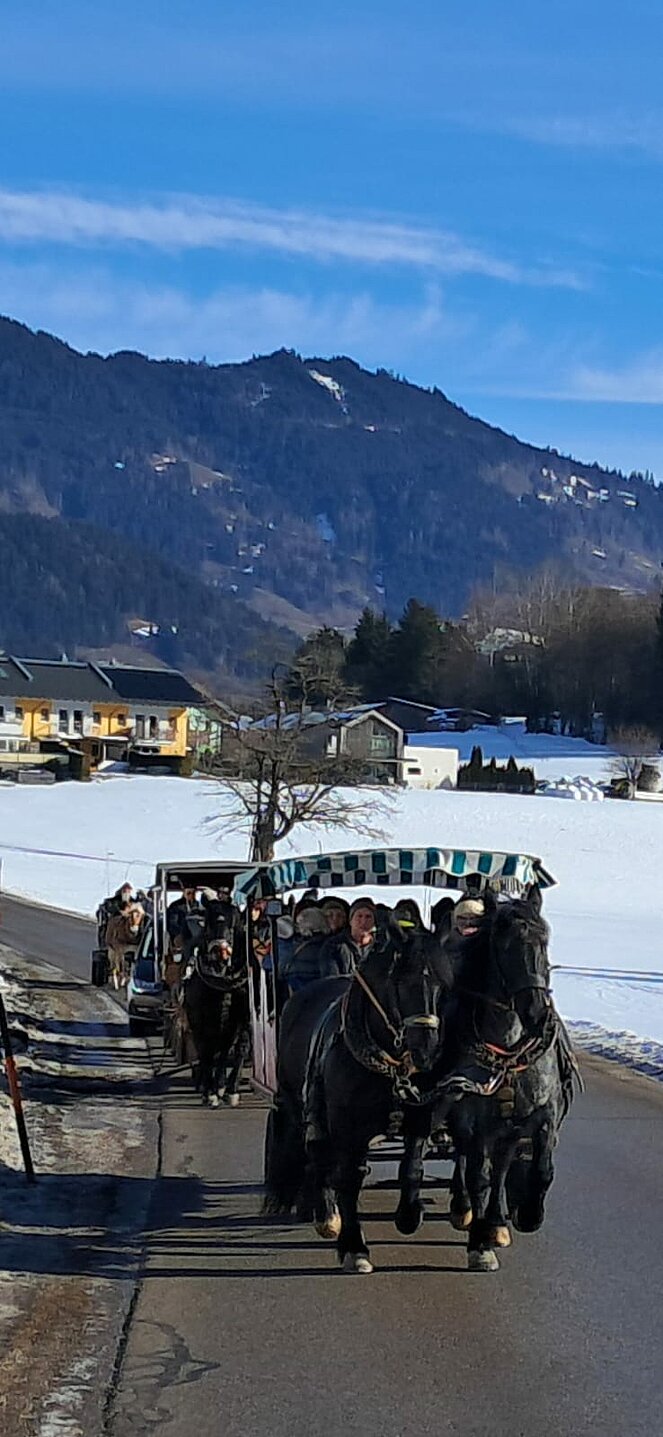 Der erste Ausflug im Jahr 2025 führte uns in den Pongau nach Goldegg. Schon bei der Abfahrt in Grödig lachte uns die Sonne entgegen und es wurde ein Wintertag wie aus dem Bilderbuch. Angekommen in Goldegg-Weng warteten bereits die Kutschen beim Stall Moser auf uns. Nachdem alle Teilnehmer auf den fünf Kutschen Platz genommen hatten und die Haflinger eingespannt waren, ging es von Goldegg-Weng zum Hotel Seeblick am Böndlsee. Nach dem Mitagessen unternahmen noch einige Teilnehmer einen kleinen Winterspaziergang. Auch die Pferde genossen ihre Mittagspause und ihr Futter. Und so gestärkt ging es wieder zurück zum Stall Moser. Das eine oder andere Schnapserl durfte natürlich auch nicht fehlen. Weiterhin begleitet von der Wintersonne ging es wieder nach Hause zurück.