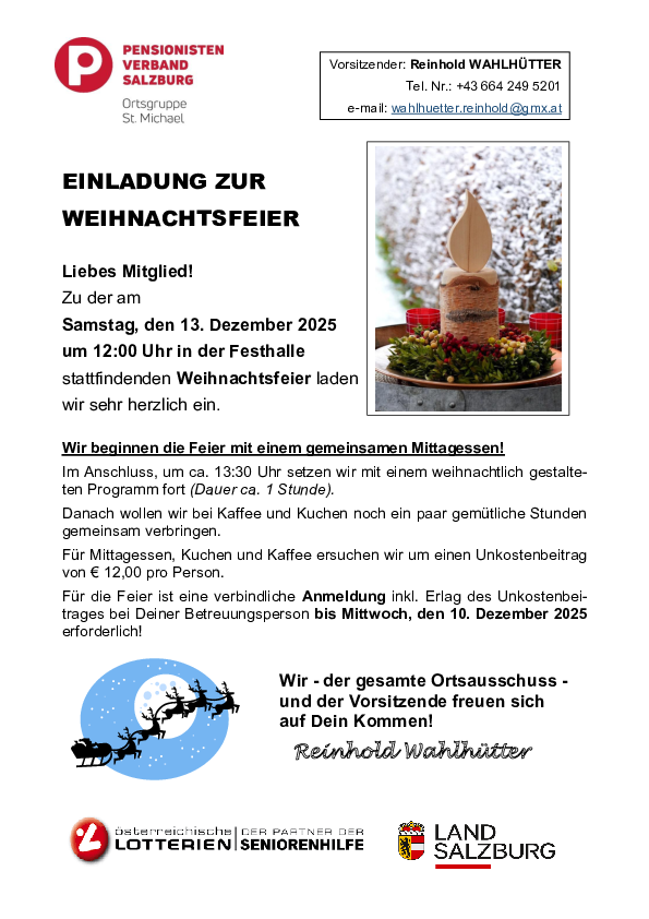 Für Mittagessen, Kaffee und Kuchen ersuche wir um einen Unkostenbeitrag von € 12,00 pro Teilnehmer!