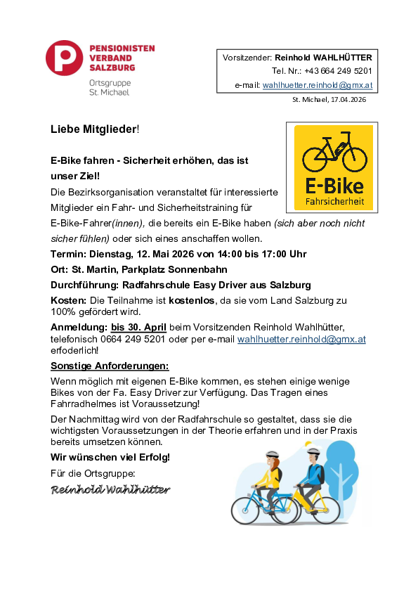 Anmeldung: bis 30. April beim Ortsvorsitzenden Reinhold Wahlhütter, telefonisch =664 249 5201 oder per e-mail: wahlhuetter.reinhold(at)gmx.at