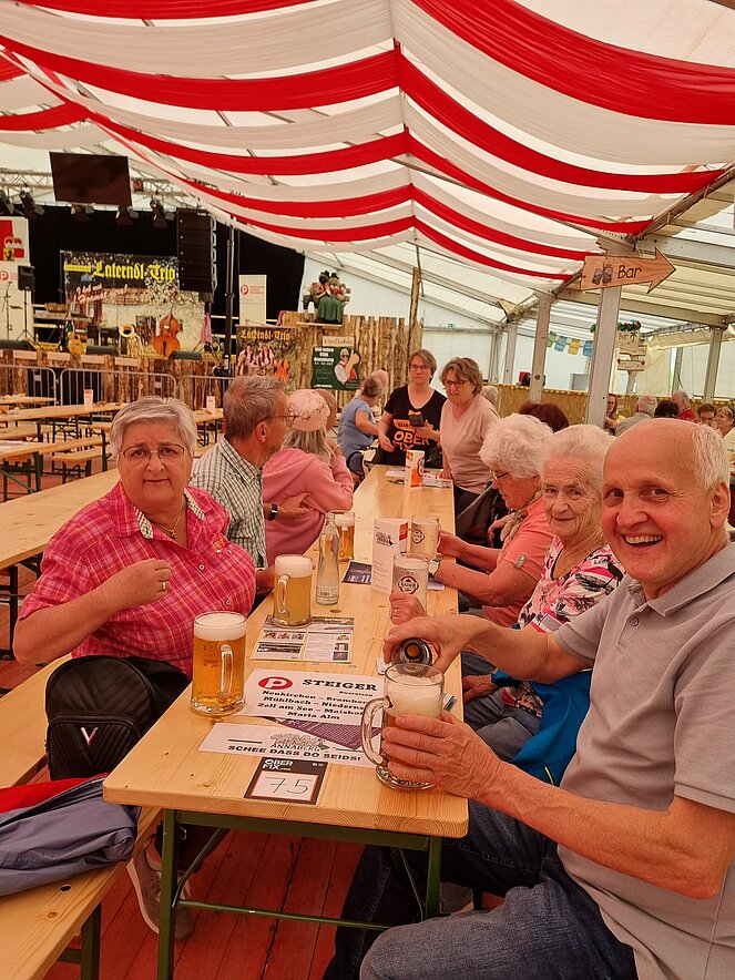 Um 07:00 Uhr ging es mit dem BUS über Maria Alm -Dienten-Mühlbach nach Annaberg wo um knapp nach 09:00 Uhr unsere Ankunft war. Nach Karten-Besorgung und kurzer Orientierung absolvierten wir unseren Rundgang, der in unterschiedliche Fitness-Kategorien aufgeteilt war. Die Einkehr im Festzelt hat sich für unsere Gruppe um ca 11:00 ergeben. Bei ausgezeichnetem, freundlichen und schnellem Service konnten wir Getränke und Grillhendl konsumieren. Anschließend wurden obligate Reden vom PVÖ Landespräsidenten SBG, PVÖ GF Gerlinde Zehentner, Vize-BM Annaberg, Peter Eder SPÖ/AK und Nadine Eder Landessekretärin SBG, gehalten. Aufgrund der langen Reisezeit mussten wir bereits vor Beginn der Verlosung und Tanzmusik wieder abreisen. Es war ein bestens organisiertes Treffen mit sehr vielen Teilnehmern aus dem gesamten Bundesland Salzburg.
