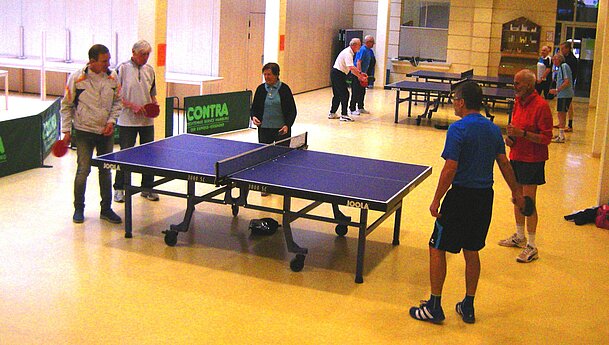 Jeden Montag von 17h bis 19h, mit Ausnahme der schulfreien Tage, ist in der Aula der neuen Mittelschule Saalfelden Gelegenheit zum Tischtennisspielen für Mitglieder des Pensionistenverbandes. Die Schule befindet sich im Zentrum von Saalfelden, nicht weit vom großen Parkplatz. Es stehen fünf Tische zur Verfügung auf denen auf denen je nach Lust und Zahl der Spieler zu zweit oder zu viert gespielt wird. Im Vordergrund steht ein geselliges Spielen zur Unterhaltung. Auch sportliches Spielen ist möglich. Es gibt dabei auch viel zum Lachen. Tischtennis ist ein gutes Training für die Koordination, Reaktion und Beweglichkeit des Körpers. Nicht nur beim Spielen, sondern auch beim Holen und Aufheben der Bälle vom Boden. Auch das gehört dazu. Wer Lust hat kann jederzeit kommen und probieren, ohne Anmeldung.