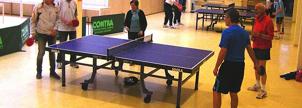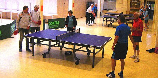 Jeden Montag von 17h bis 19h, mit Ausnahme der schulfreien Tage, ist in der Aula der neuen Mittelschule Saalfelden Gelegenheit zum Tischtennisspielen für Mitglieder des Pensionistenverbandes. Die Schule befindet sich im Zentrum von Saalfelden, nicht weit vom großen Parkplatz. Es stehen fünf Tische zur Verfügung auf denen auf denen je nach Lust und Zahl der Spieler zu zweit oder zu viert gespielt wird. Im Vordergrund steht ein geselliges Spielen zur Unterhaltung. Auch sportliches Spielen ist möglich. Es gibt dabei auch viel zum Lachen. Tischtennis ist ein gutes Training für die Koordination, Reaktion und Beweglichkeit des Körpers. Nicht nur beim Spielen, sondern auch beim Holen und Aufheben der Bälle vom Boden. Auch das gehört dazu. Wer Lust hat kann jederzeit kommen und probieren, ohne Anmeldung.