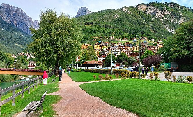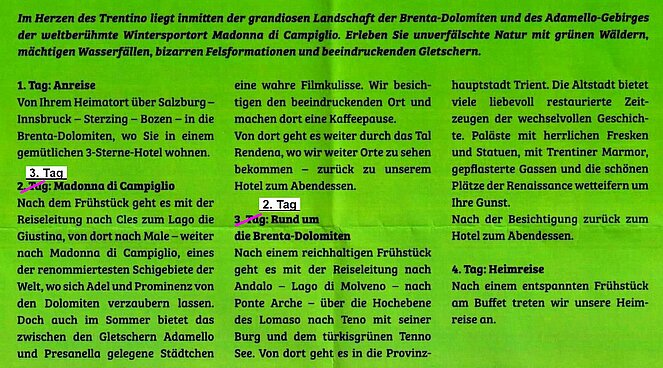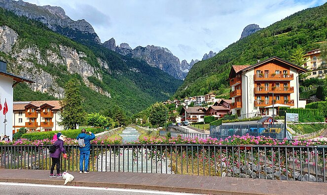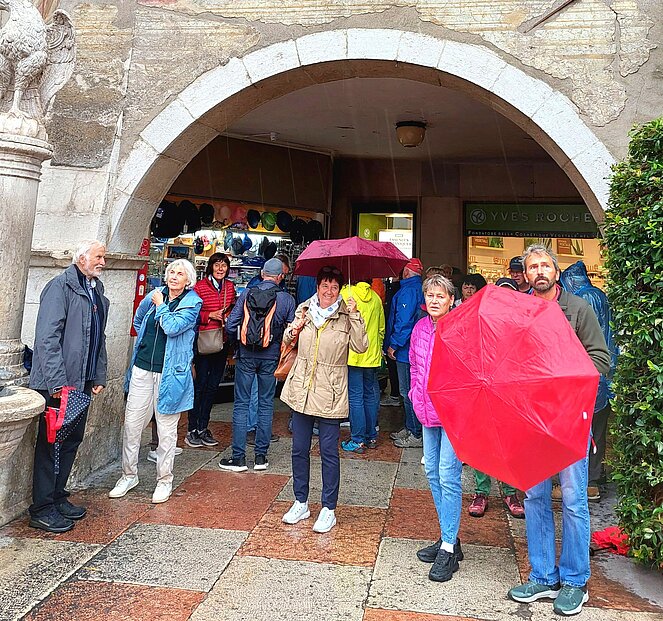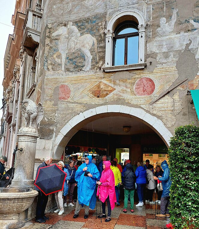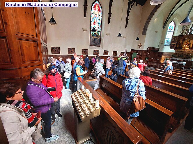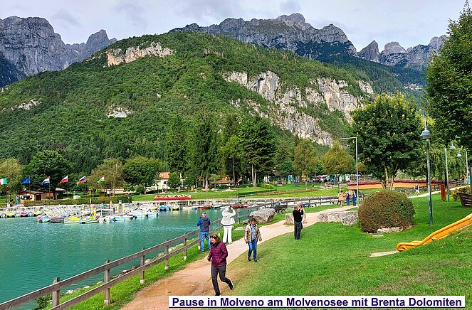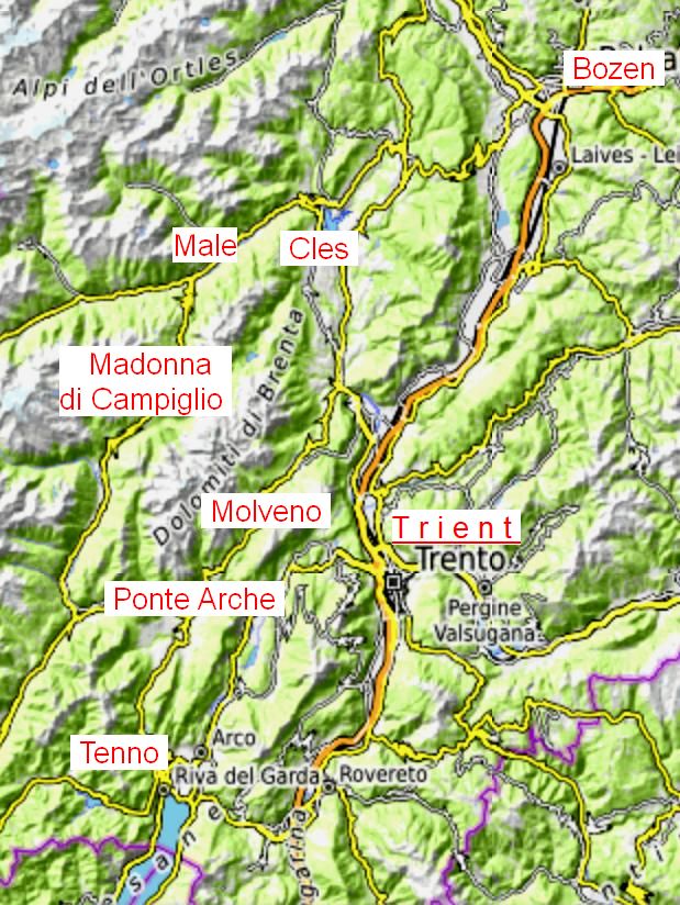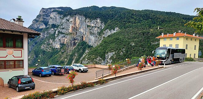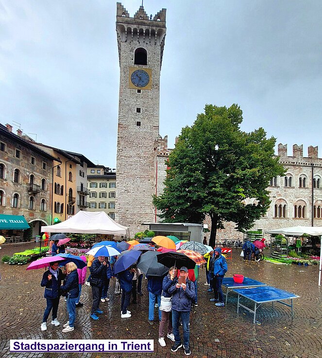 Der 2. Tag begrüßte uns mit Regen So wurde das Programm von unserer Reiseleitung kurzentschlossen geändert und wir fuhren zuerst in die Stadt Trient zu einer kurzen Rundfahrt und anschließendem Stadtspaziergang im Zentrum. Am Nachmittag fuhren wir durch das „Valle dei Laghi“ und „Sarca Tal“ zu einem kurzen Zwischenstopp nach Riva am Gardasee. Anschließend ging die Fahrt weiter hinauf nach „Tenno“, am Tenno See vorbei, über die Hochebene von Ballino nach „Ponte Arche“, Molveno See, „Molveno“ und über „Andalo“ zurück zu unserem Quartier. Alle waren beeindruckt von der wilden Landschaft, den tiefen Schluchten, hohen Bergen und trotzdem, den vielen verstreuten Ortschaften.