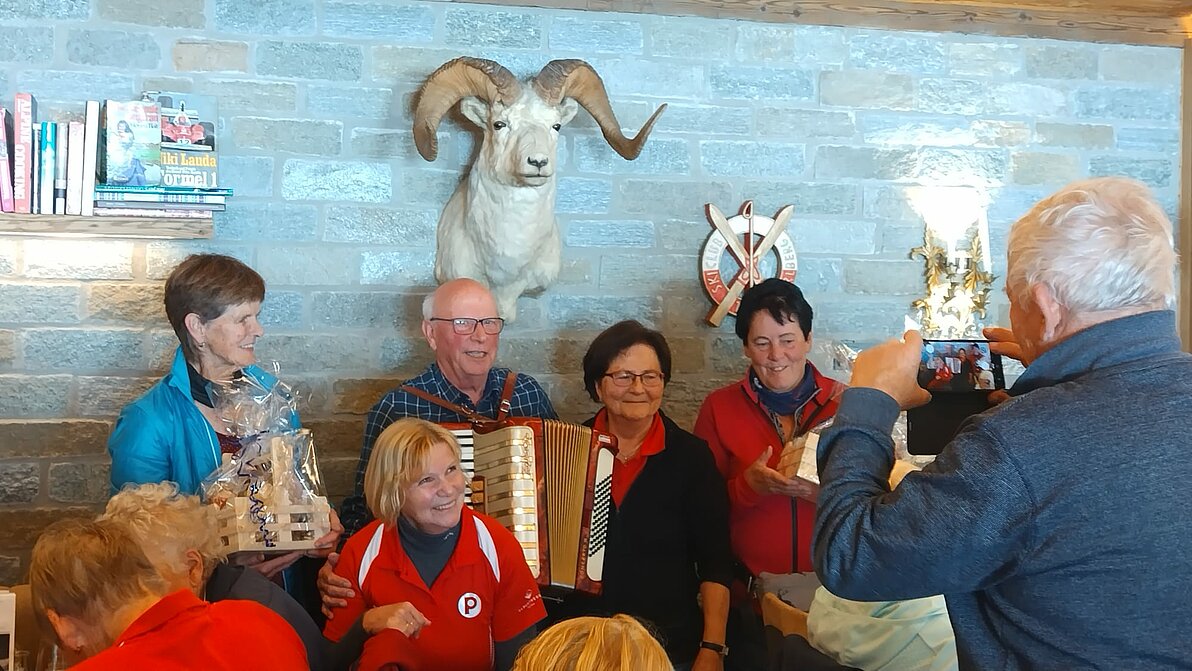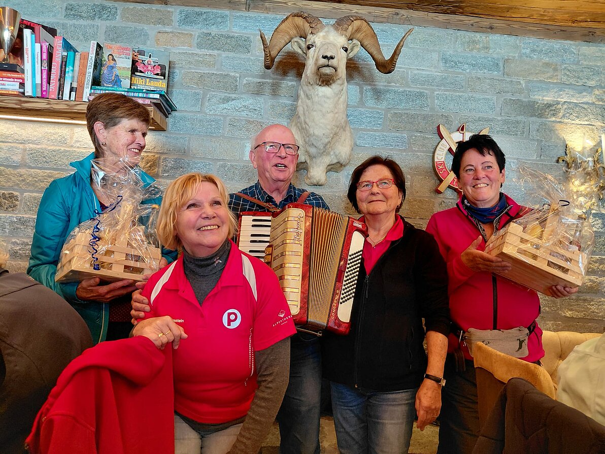 Der Obmann und die Wanderer bedankten sich noch bei den beiden Wanderführerinne Christl Reitsamer und Hettegger Rosalinde mit einem kleinen Jausenkorb. Die meisten fuhren um 15:00 Uhr mit dem Bus zurück und bei den restlichen weiss ich noch nicht, ob sie schon noch heute nach Hause kommen.
