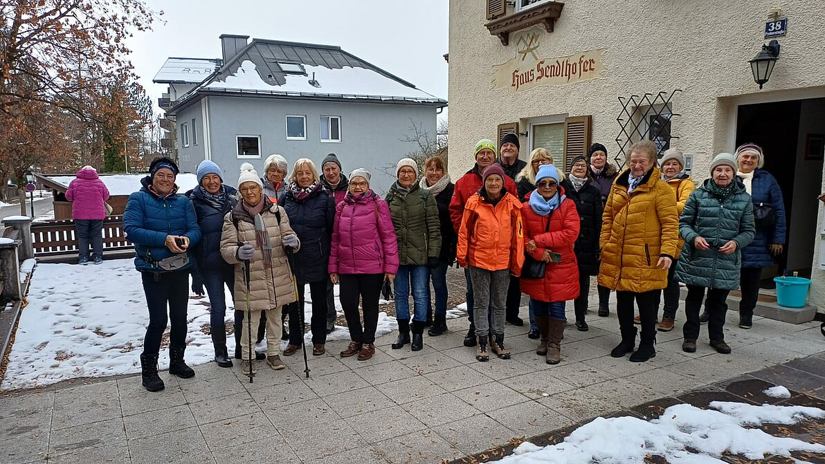 Zur bereits 3 Winterwanderung trafen sich 22 Pensionisten am Busbahnhof. Zu Fuß ging es über die Weitmoserallee - Achenpromenade- Hochwasserbrücke- Felding zur Schnaspslabestation von Anna in der Pyrkerstrasse. Danach ging es gemütlich weiter über den Ort zu unserem Stüberl beim Sportplatz. Dort warteten bereits unsere Stüberdamen und Zrnjevic Gerhard, unser Bosnaspezialist auf uns. Bei Glühwein oder Bier genossen wir die geschmacksvollen Bosnas